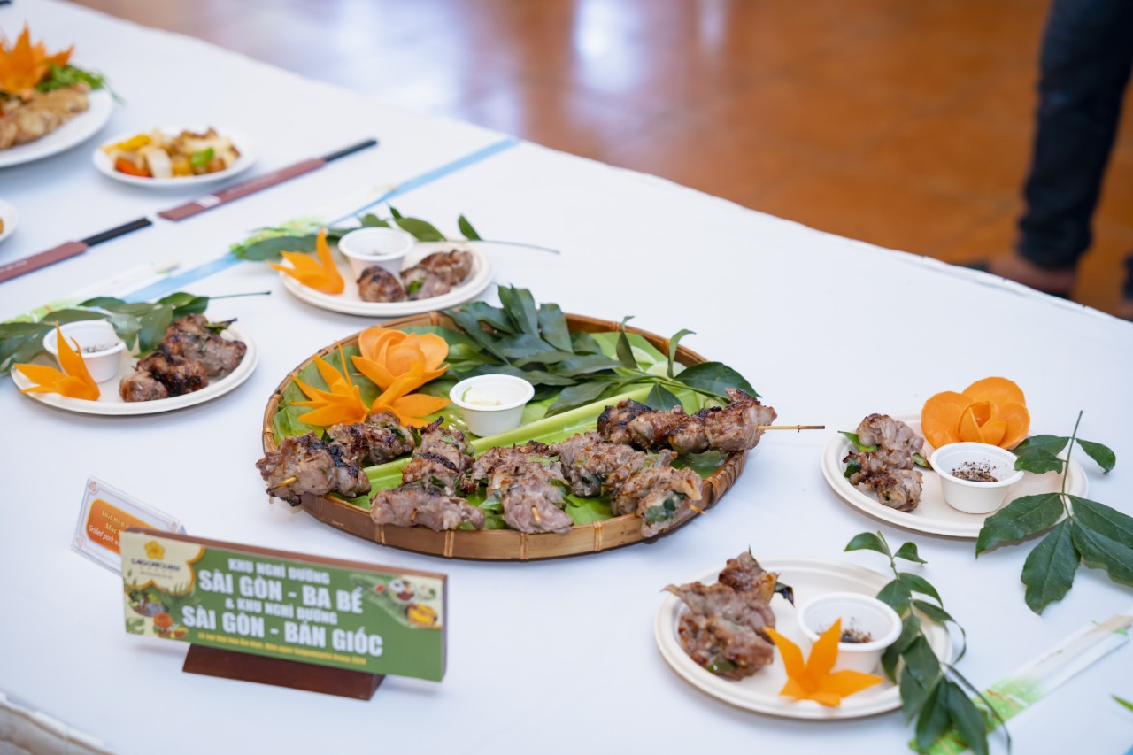 Các thành viên ban giám khảo đã lần lượt đến từng điểm thi thưởng lãm nghệ thuật trang trí, sau đó vừa thử vị món ăn vừa nghe đơn vị dự thi thuyết trình về món ăn đã được mỗi đơn vị công phu chuẩn bị, thể hiện sự sáng tạo trong cách thể hiện cũng như gửi gắm vào đó tâm huyết, tình yêu dành cho món ăn của quê hương mình. Trong ảnh là món heo bản nướng lá mắc mật (khu nghỉ dưỡng Sài Gòn - Ba Bể và Sài Gòn - Bản Giốc).
