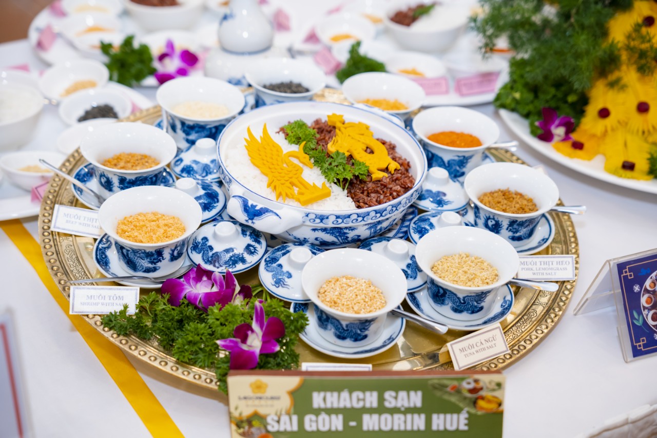 Đầu tiên là cơm muối Hoàng cung được sắp xếp nổi bật. Đây là món cơm tiến vua thời xưa, đến từ xứ Huế mộng mơ. Cái khó của món này là nguyên liệu. Nếu như thời xưa cơm được làm từ gạo de An Cựu, thì hiện nay món cơm muối hoàng cung trong lễ hội là gạo ST25 và gạo lứt. Có 9 loại muối, như muối đậu phộng, muối tôm, muối cá hồi, muối thịt heo, muối cá ngừ, muối ớt…