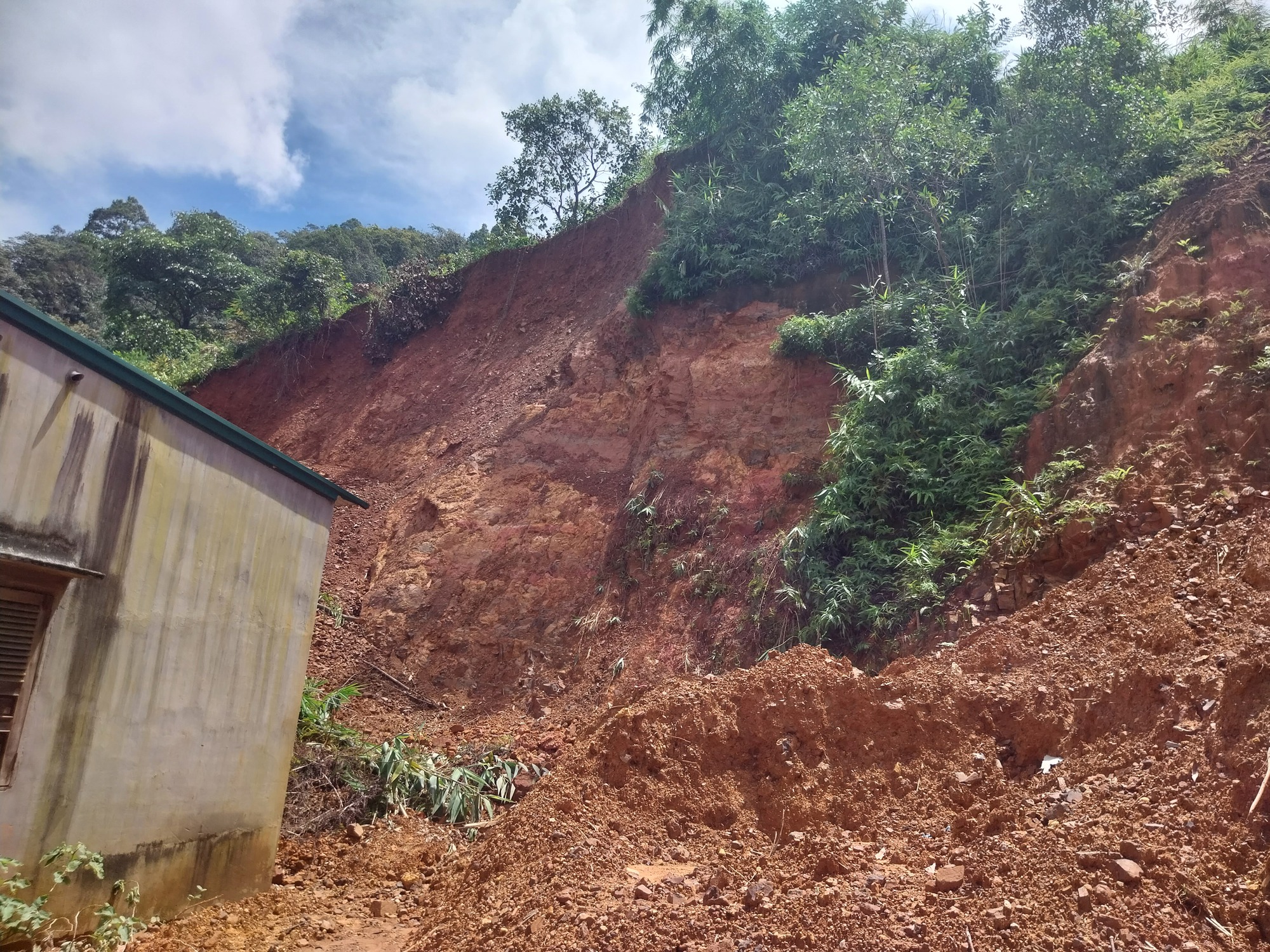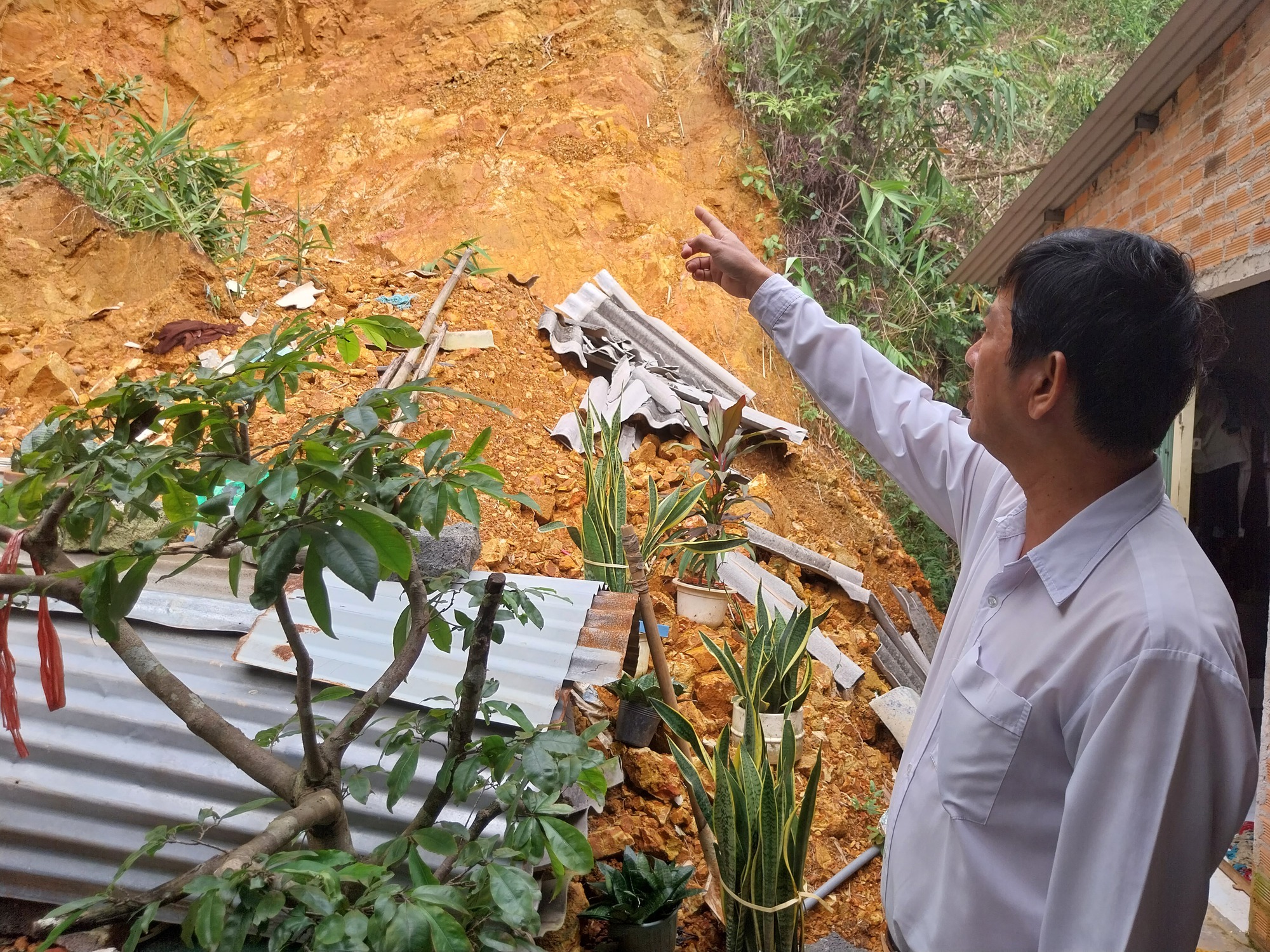 "Tôi liền ôm cháu nhỏ chạy lên phía trước. Đến khi hoàn hồn, xuống coi khu nhà sau thì hỡi ôi, nhà vệ sinh, nhà bếp, nồi niêu xoong chảo chén bát bị đất đá vùi lấp tan hoang", bà Nguyệt bàng hoàng kể lại.