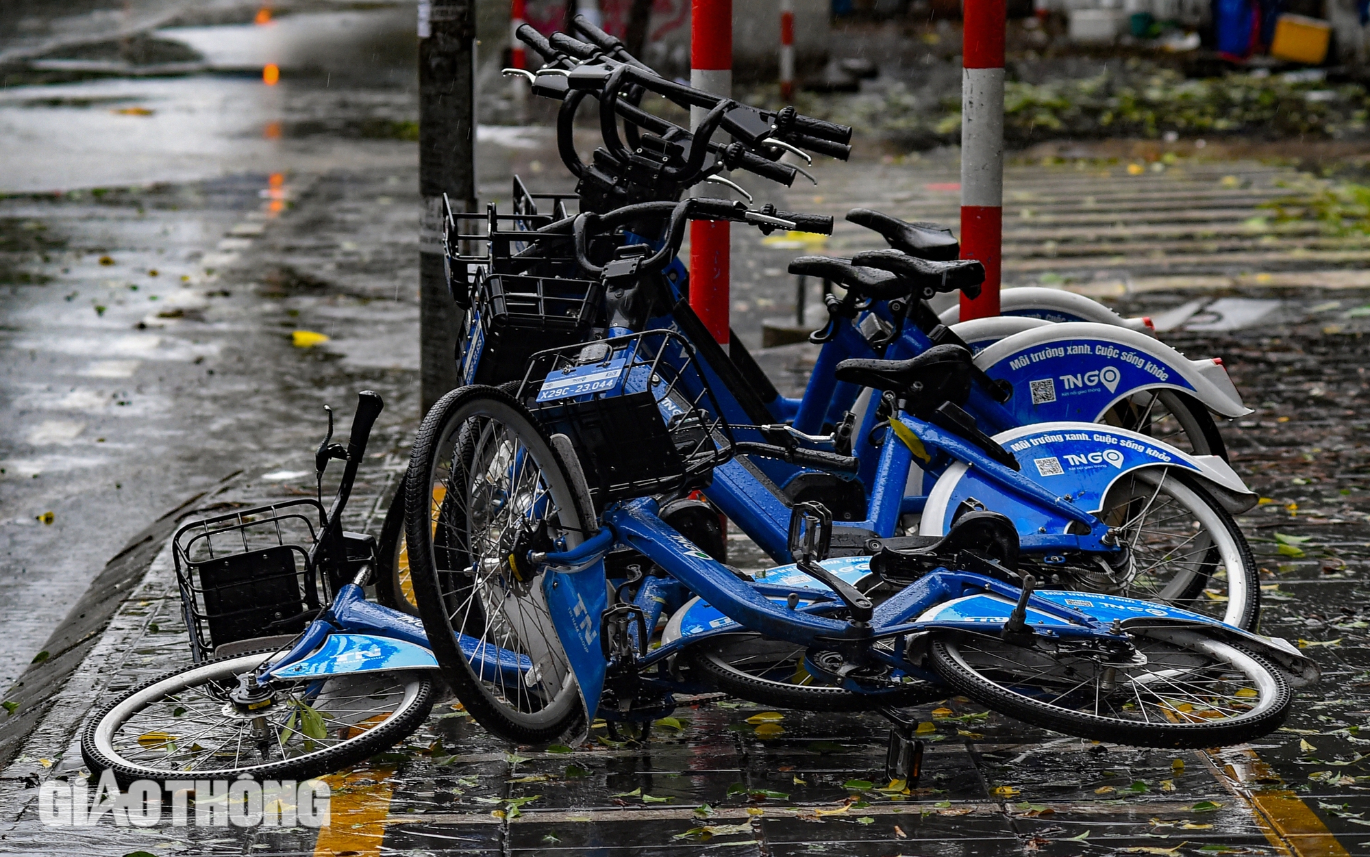 Nhiều xe đạp công cộng đỗ trên vỉa hè bị hất đổ.