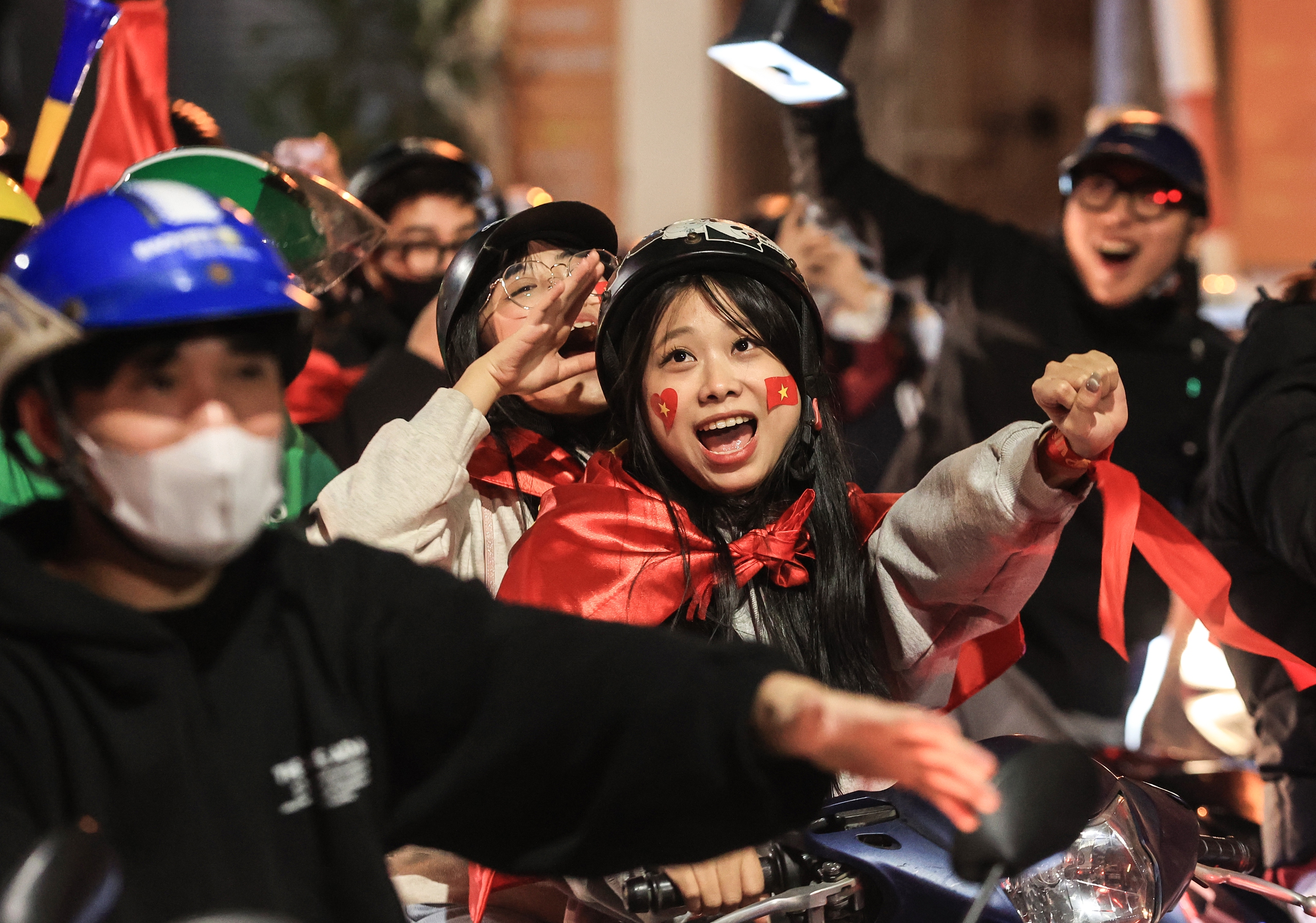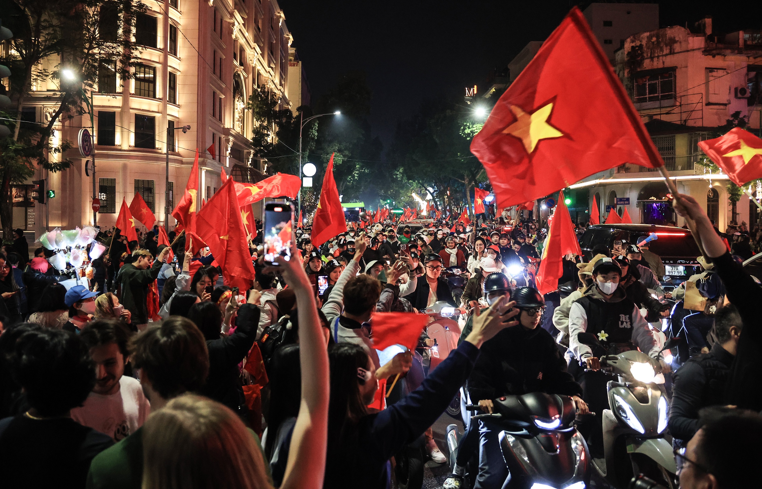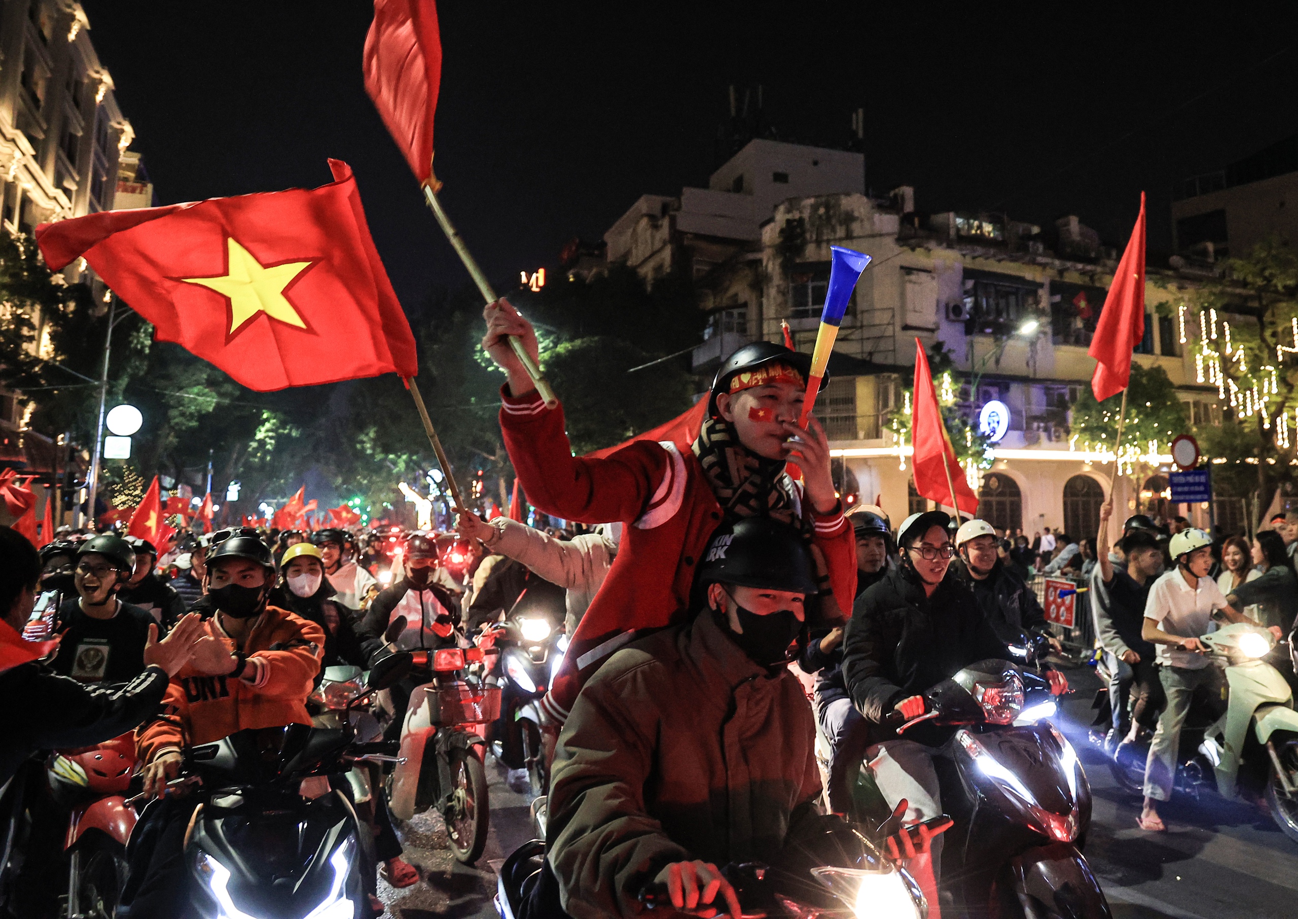 Người dân cầm theo cờ đỏ sao vàng, kèn và các vật cổ vũ đổ ra đường sau khi xem trận chung kết lượt về đầy kịch tính.