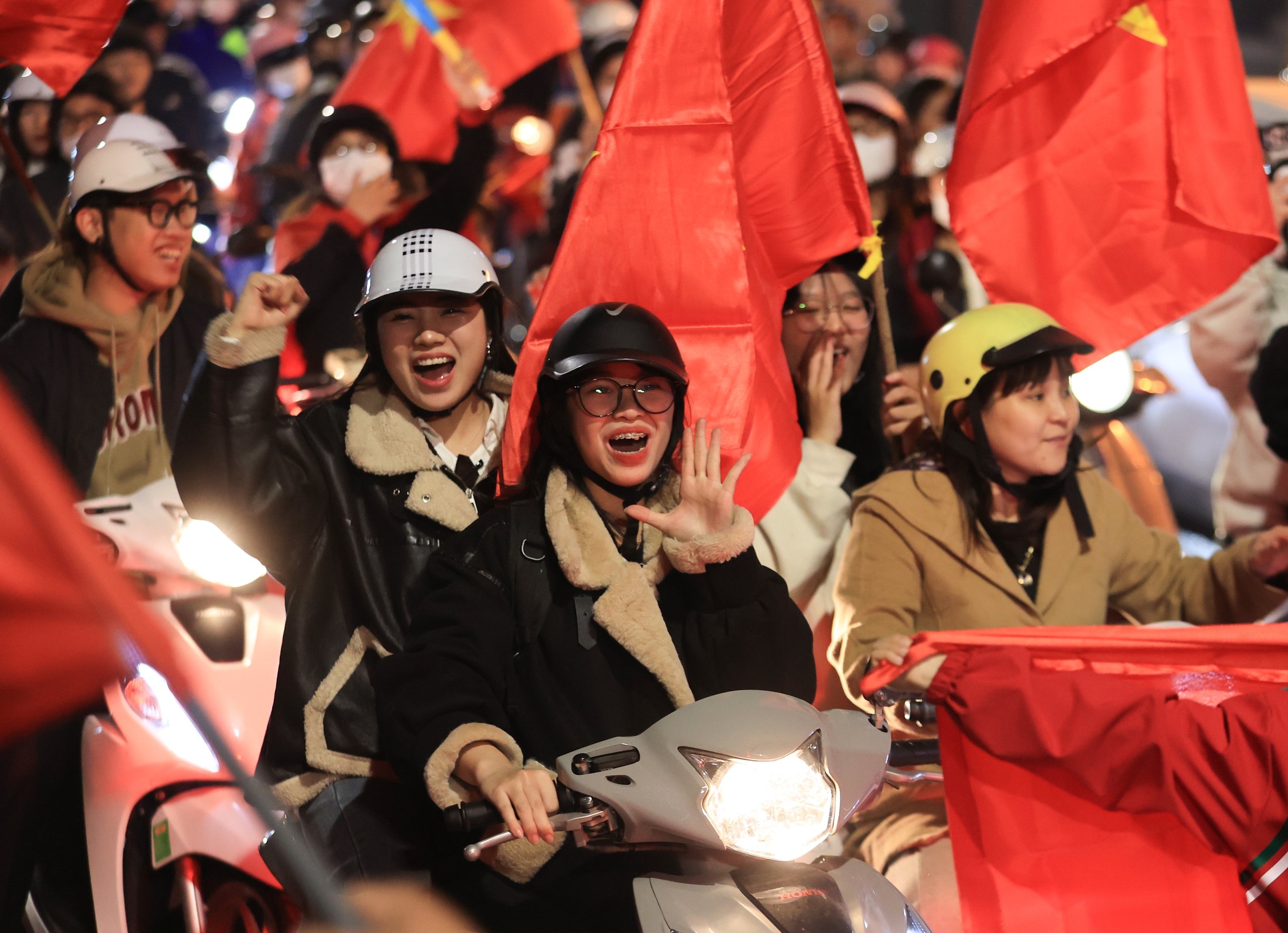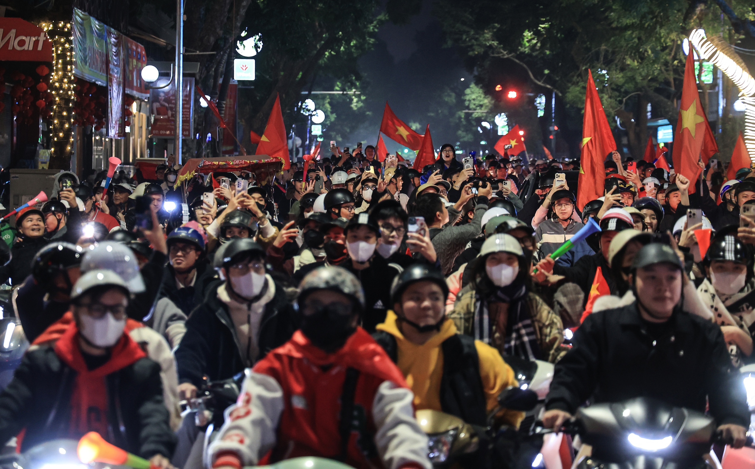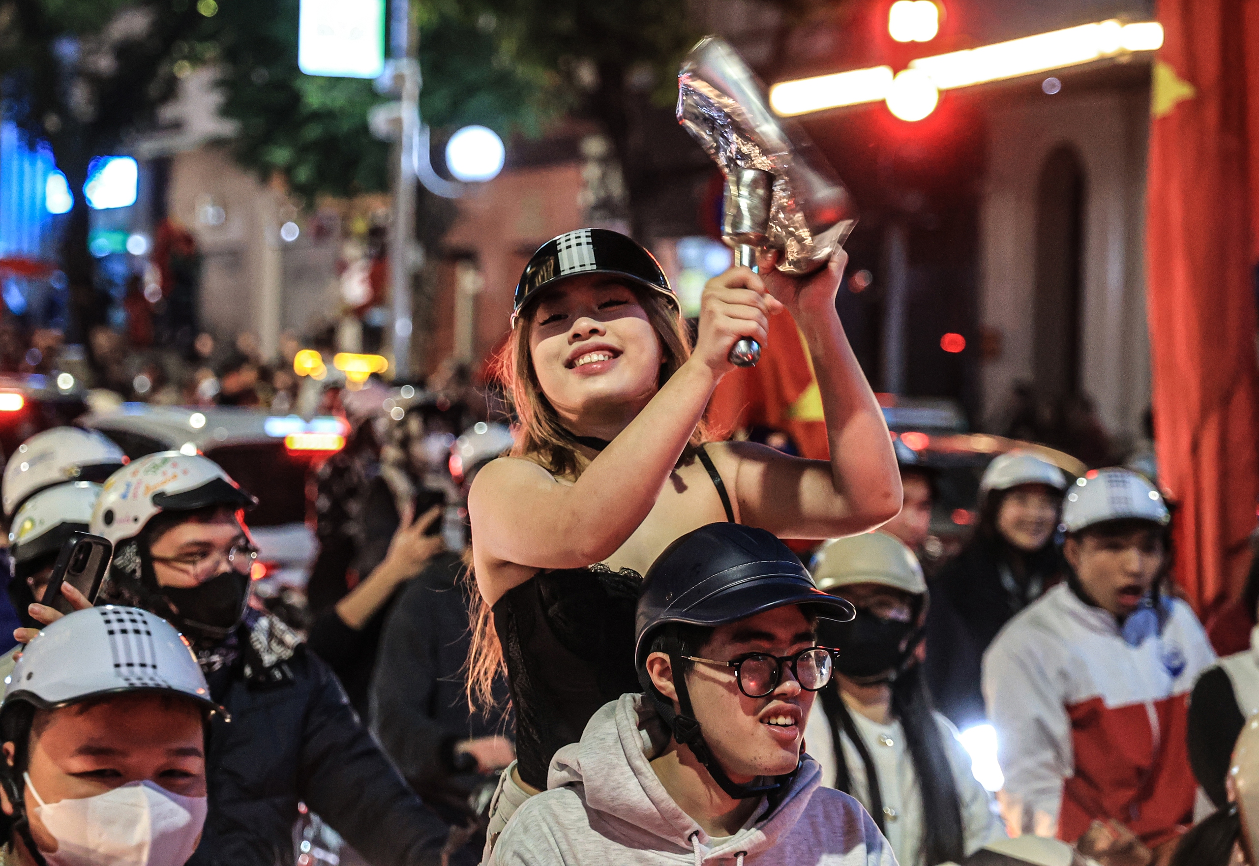 Người dân cầm theo cờ đỏ sao vàng, kèn và các vật cổ vũ đổ ra đường sau khi xem trận chung kết lượt về đầy kịch tính.