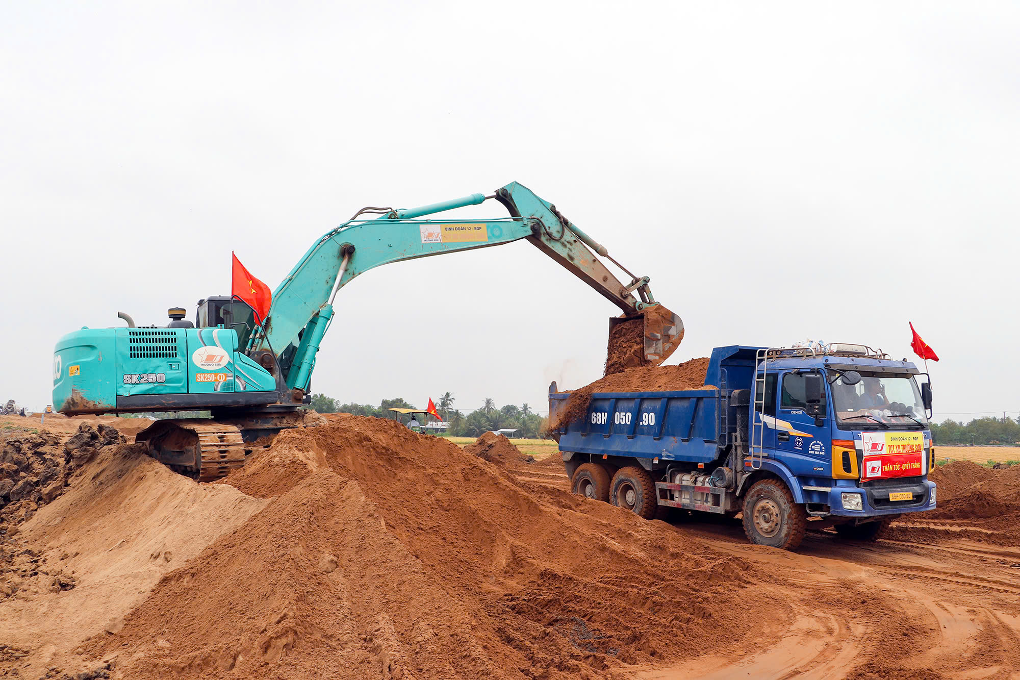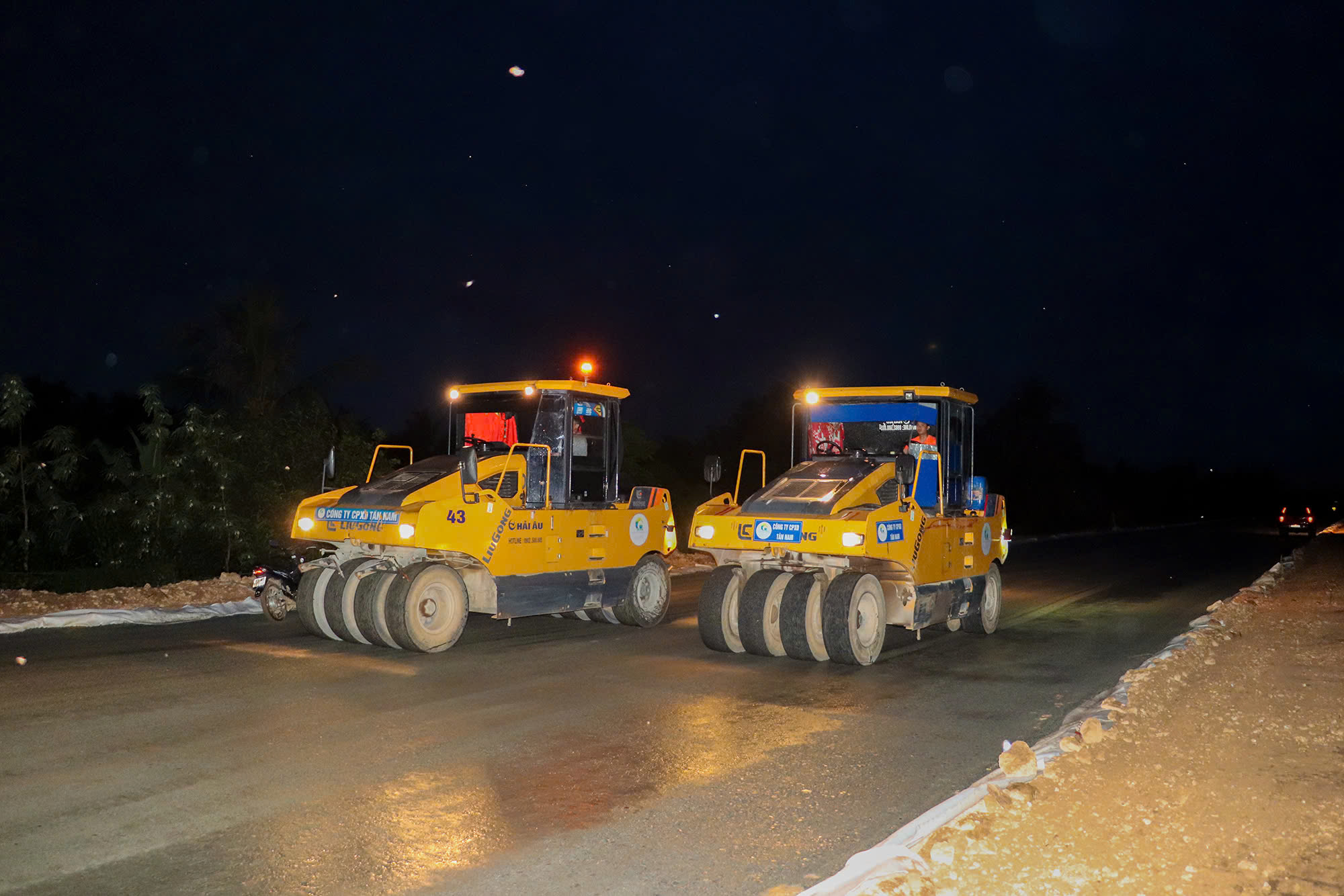 Cát được dở đến đâu, nhà thầu tập trung xe lu nền đến đó.