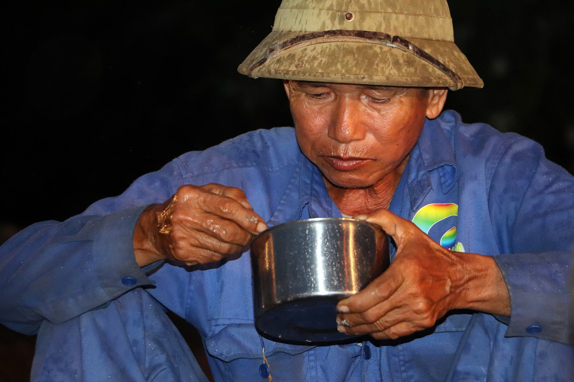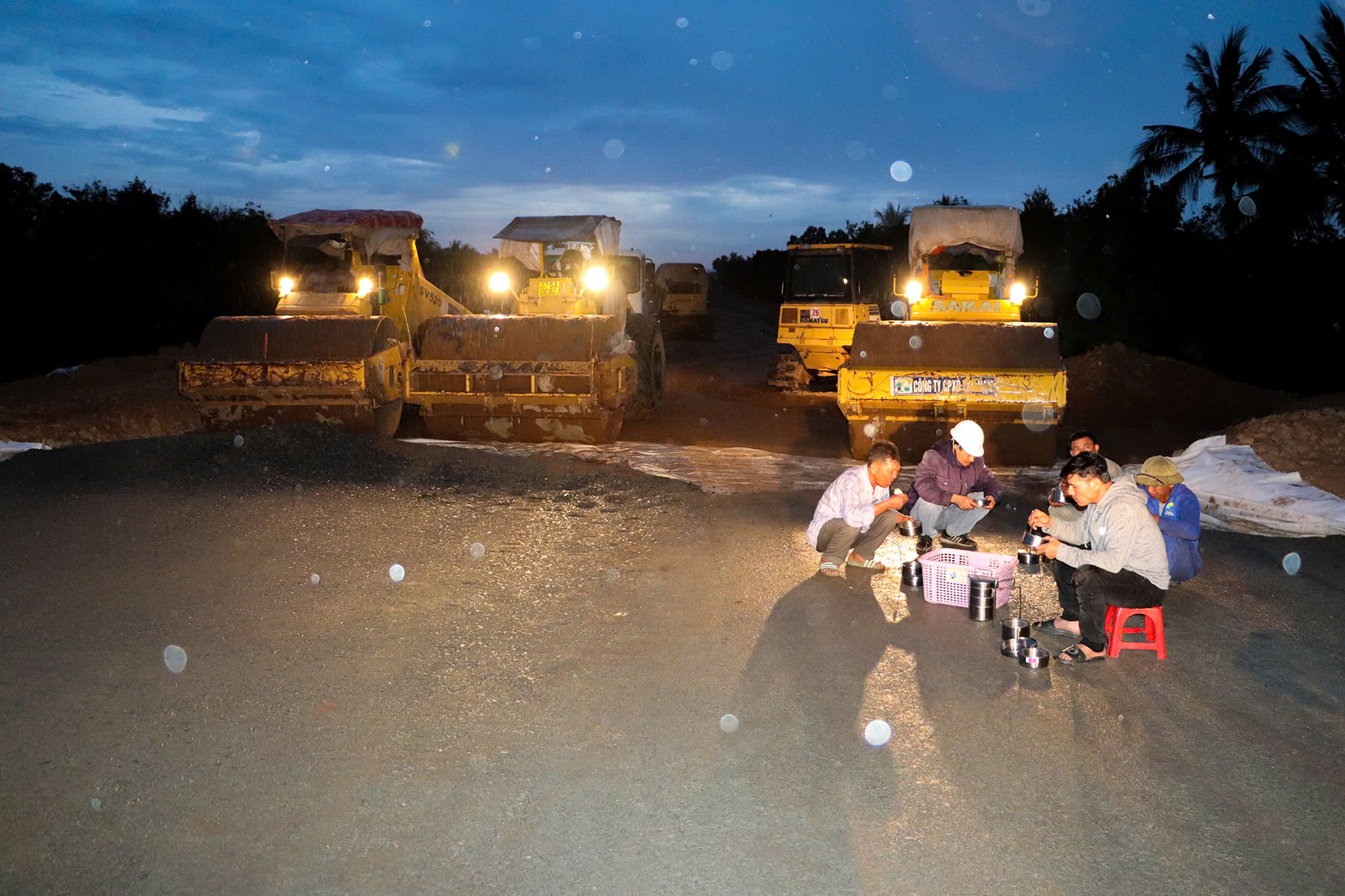 Bữa cơm vội trong đêm, ngay trên công trường cao tốc Cần Thơ - Cà Mau.