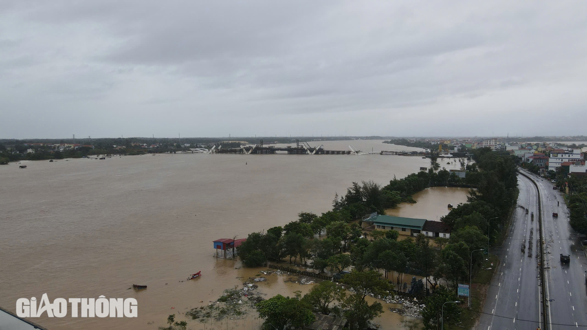 Tại vị trí cầu Nhật Lệ 2, do lo lắng nước lũ lên, rất nhiều phương tiện của người dân được đưa lên cầu để đảm bảo an toàn.