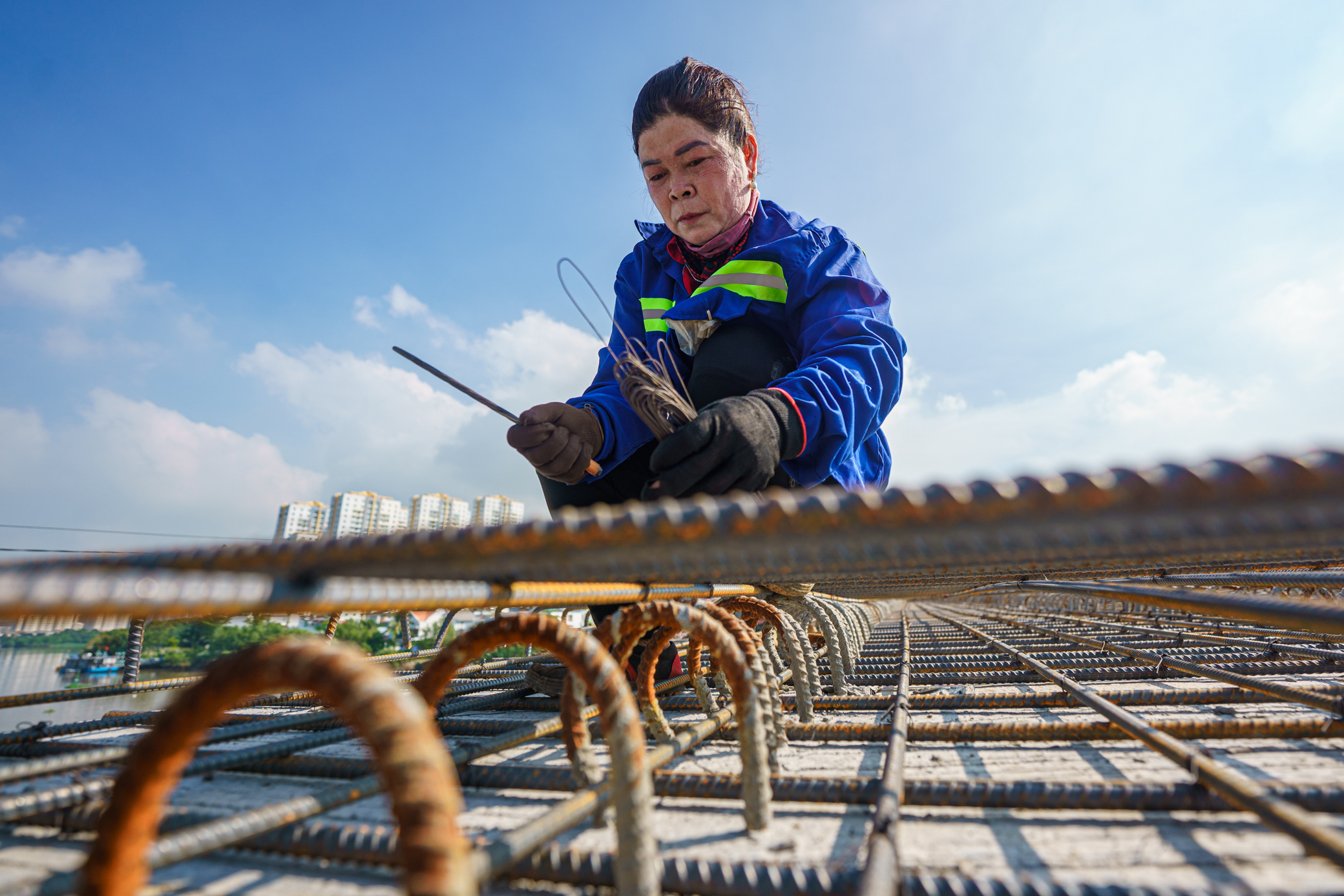 Chị Đinh Thị Bể (53 tuổi) đang thực hiện công tác buộc kẽm tạo khung thép để chuẩn bị đổ bê tông bản mặt cầu. Đây là đoạn mặt cầu vừa được hợp long.