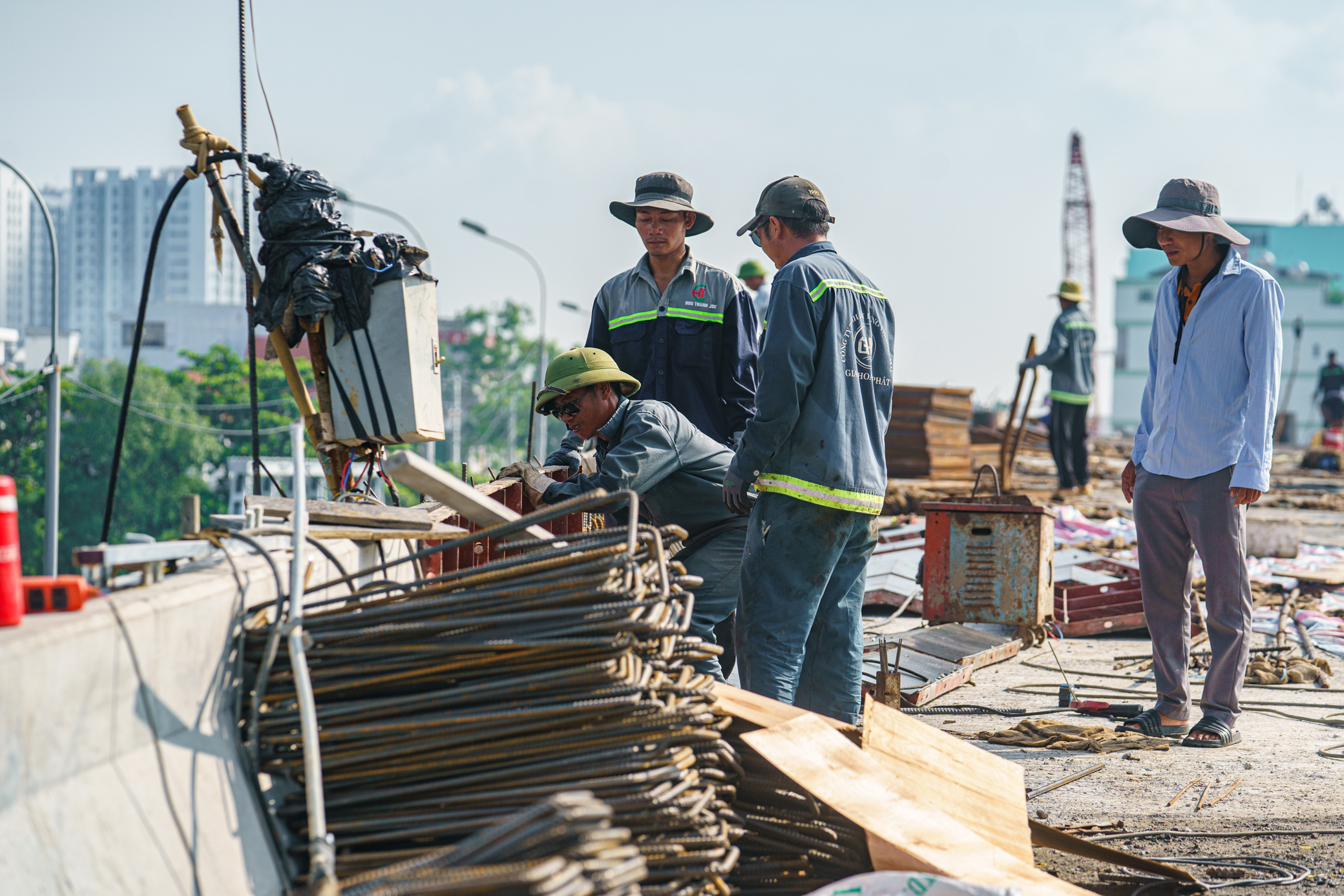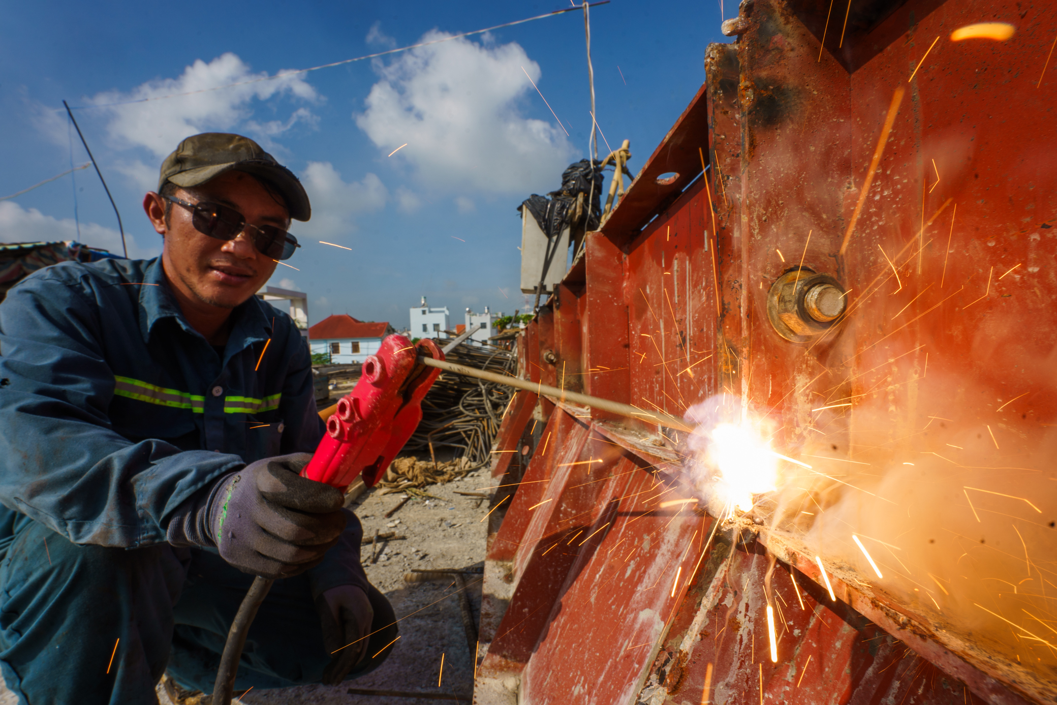Công nhân Nguyễn Văn Thế đang hàn khung thép của phần lan can cầu. Anh Thế cho biết rất vui khi là một trong những công nhân theo dự án từ ngày tái khởi động. "Ngoài công việc kiếm tiền, tôi cũng rất vui được là một phần của sự thành công khi hoàn thành cây cầu này", anh Thế chia sẻ.