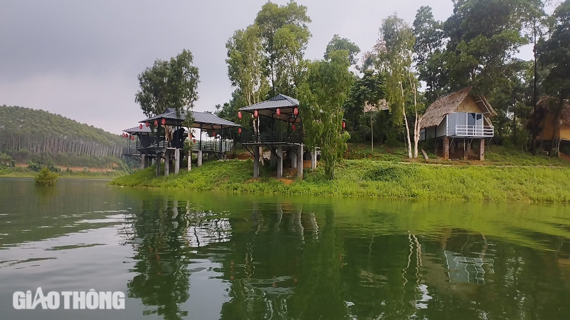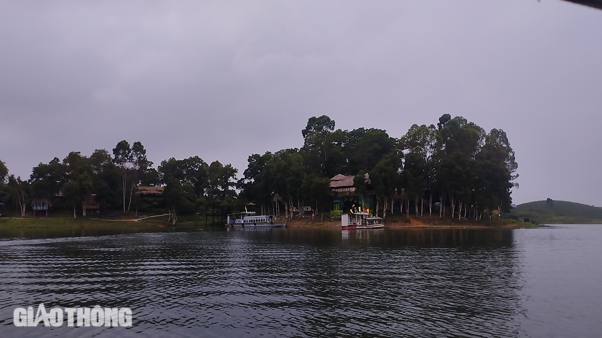 Nhóm người của Công ty S.B (trụ sở tại huyện Lục Yên, tỉnh Yên Bái) đến hồ Thác Bà chơi mô tô nước, kéo theo phao bơm hơi (do nhóm người của công ty tự mang theo), cách khu vực khu du lịch Đảo Xanh 30m. Theo tìm hiểu của PV Báo Giao thông, khu du lịch Đảo Xanh đang được xây dựng không phép trên đất rừng trồng khoảng 1,8ha.