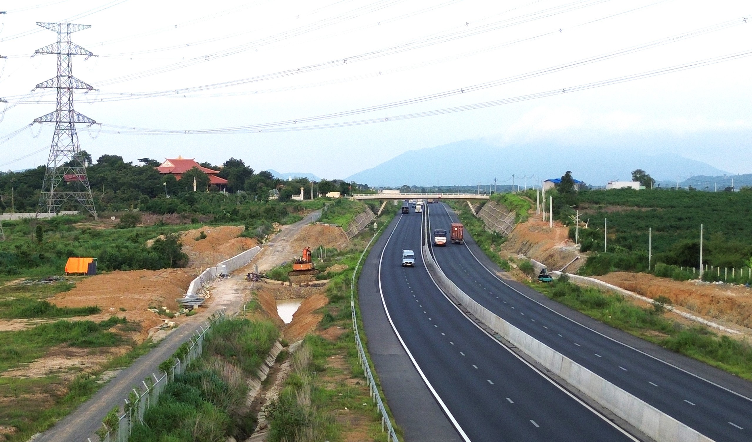 Theo ghi nhận của PV đến ngày 15/8, đơn vị thi công đã hoàn thành các hạng mục xây tường chắn, cống thoát nước. Nhà thầu đang gấp rút hoàn thiện thi công các hạng mục hồ điều hòa bên trái tuyến tại Km25 qua xã Sông Phan (huyện Hàm Tân).