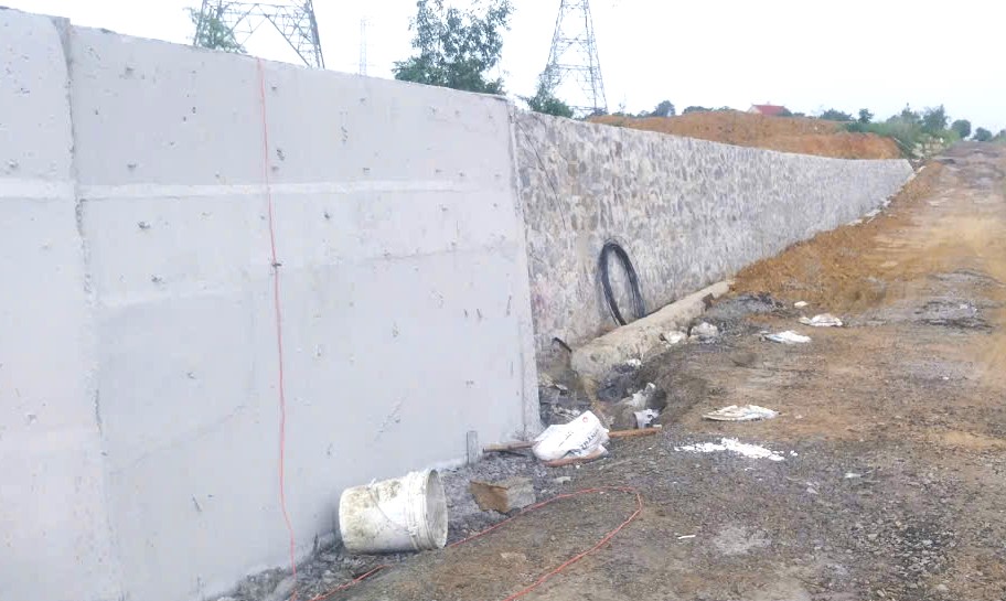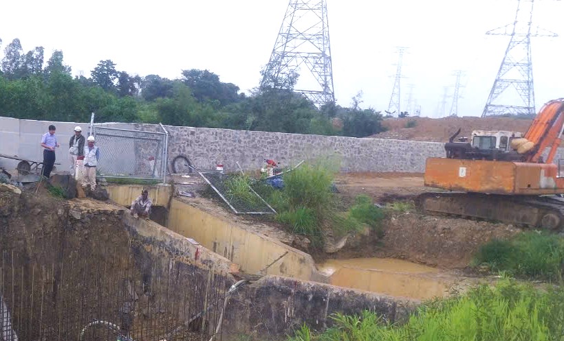 Trong ảnh nhìn từ trên cao là hàng rào tường chắn, hồ điều hòa thu nước và sẽ được đấu nối thông với hệ thống rãnh, thoát nước bổ sung.