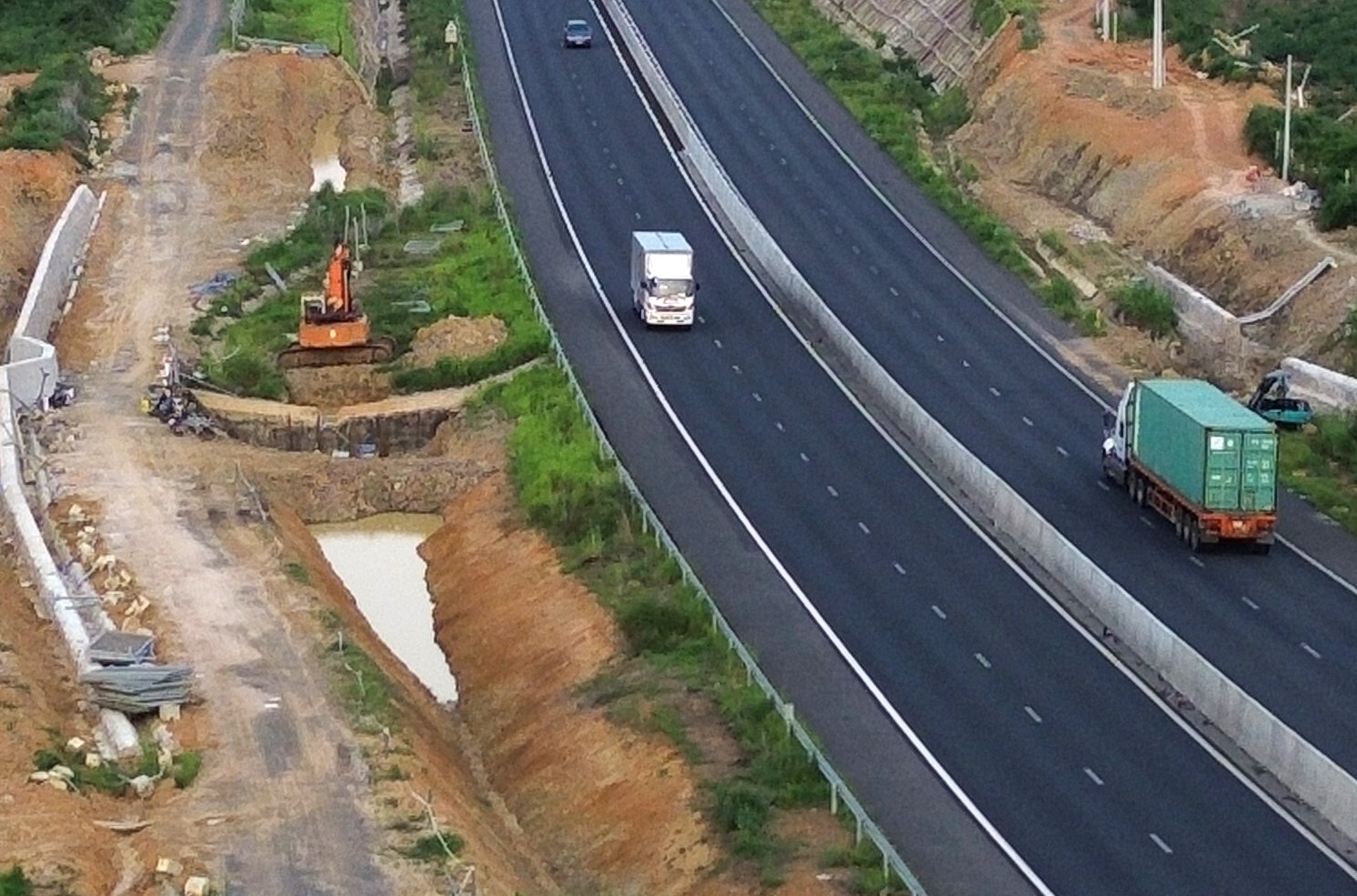 Bên phải tuyến cũng được bổ sung tường chắn đá, các vị trí cầu cống thi công tường chắn bê tông cốt thép. Tại đây, nhà thầu đã thi công hoàn thiện rãnh thu nước về hồ điều hòa với thể tích chứa 831m3.