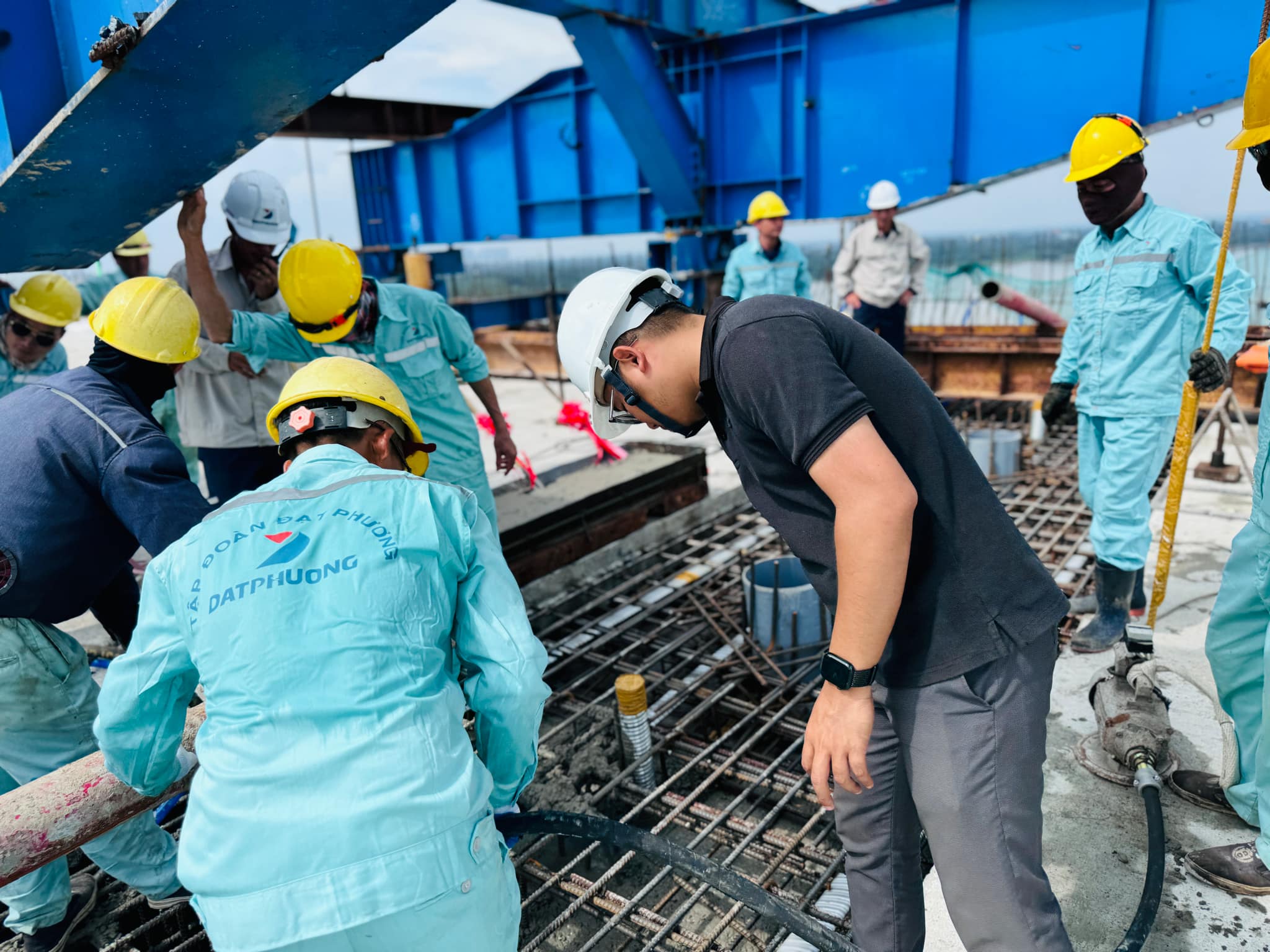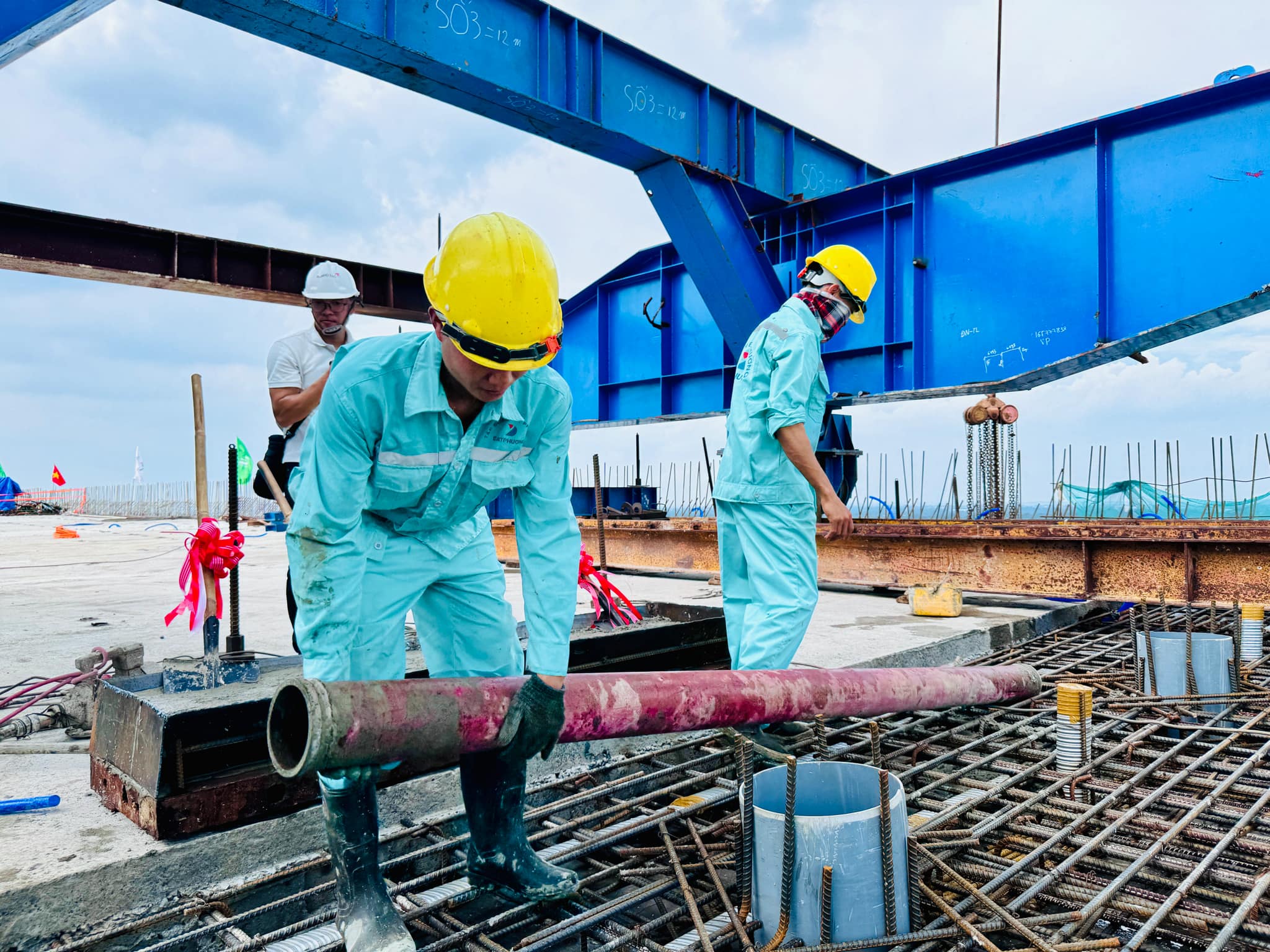 Tất cả các công đoạn đều được thực hiện cẩn thận, dưới sự giám sát chặt chẽ (Trong ảnh, công nhân của nhà thầu Đạt Phương đổ bê tông hợp long hai nhịp cầu).
