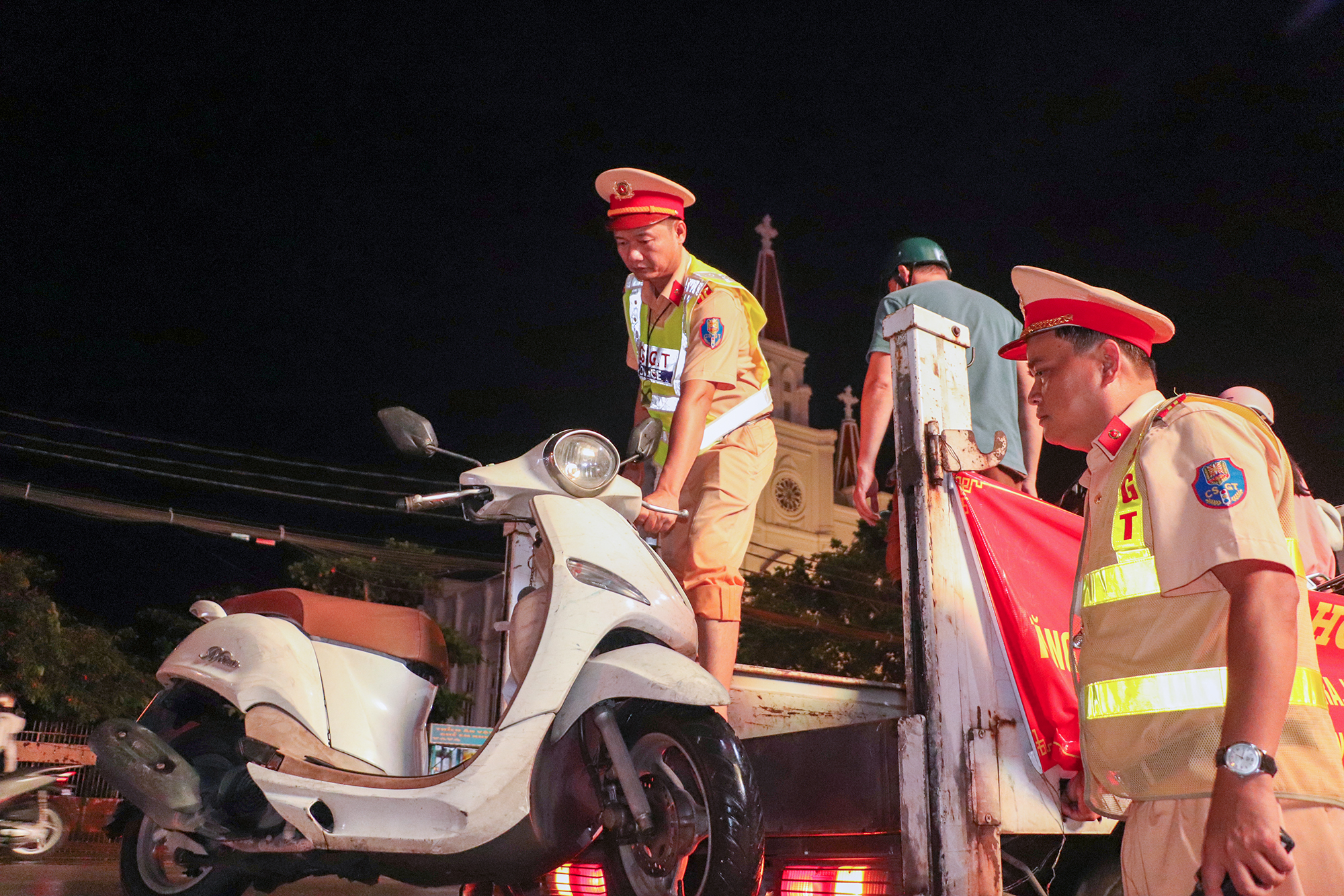 Đặc biệt, đơn vị còn huy động xe tải chuyên dụng để chở người dân và xe máy qua các đoạn ngập nặng, giúp việc di chuyển thuận tiện, an toàn.