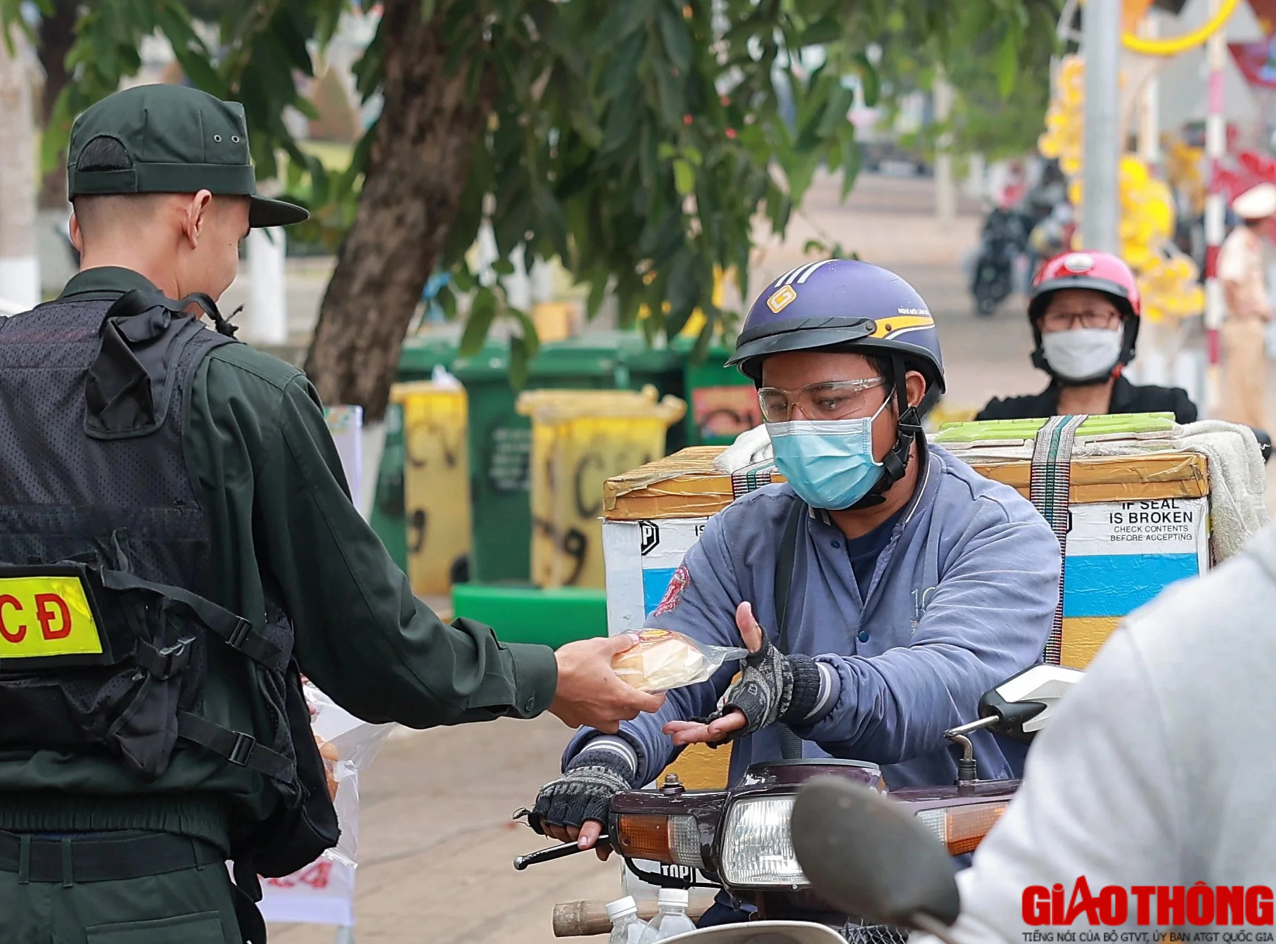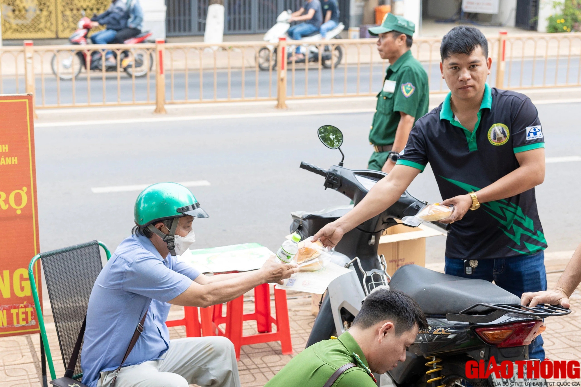 Ngoài hướng dẫn lộ trình, điều tiết giao thông, cảnh sát còn lập các điểm tặng nước suối, khăn lạnh, khẩu trang, vật phẩm thiết yếu... cho người đi đường.