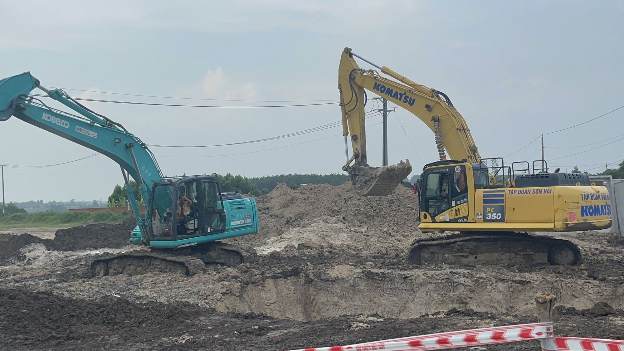 Hàng trăm máy móc và nhân công hoạt động nhộn nhịp trên tuyến dự án thành phần 3. Xe cuốc, xe ủi, xe tải chở đất ra vào công trường liên tục, không khí thi công hối hả.