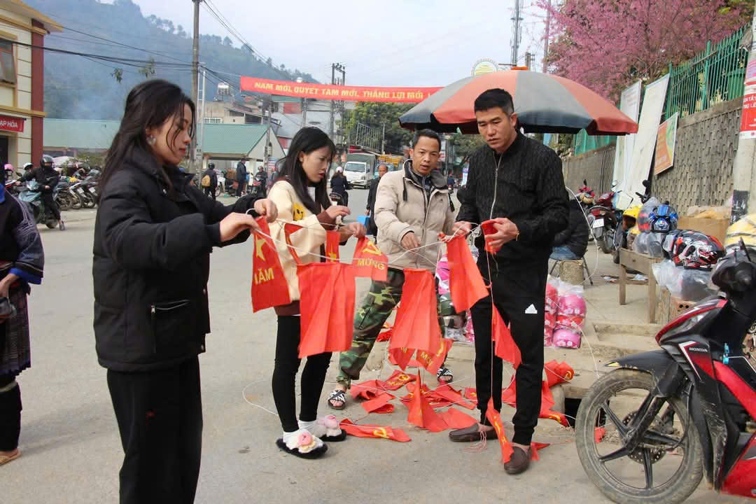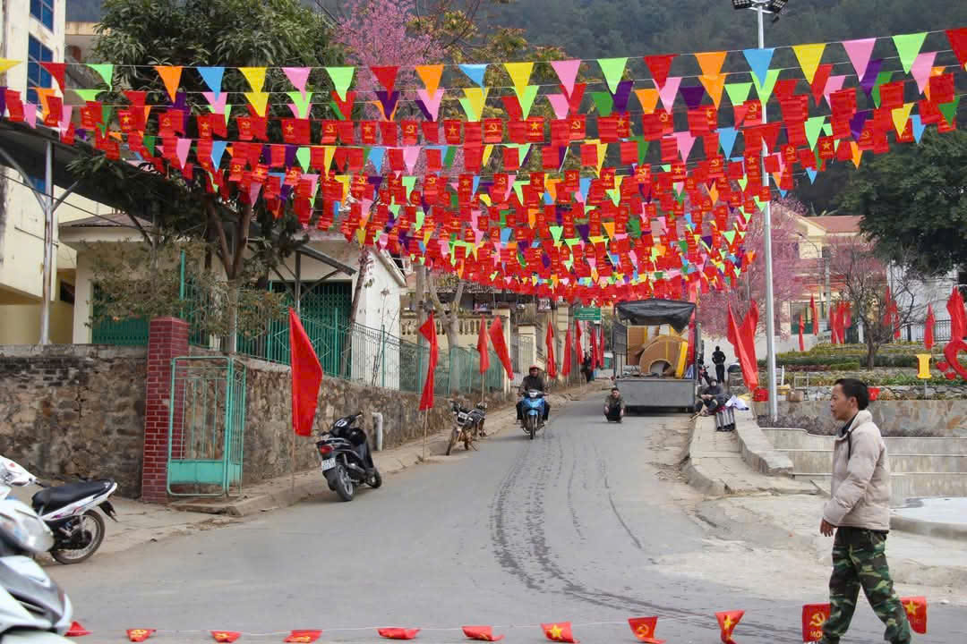 Tại huyện vùng cao Mù Cang Chải nơi có 98% đồng bào dân tộc Mông sinh sống cũng được trang hoàng cờ dọc trung tâm thị trấn