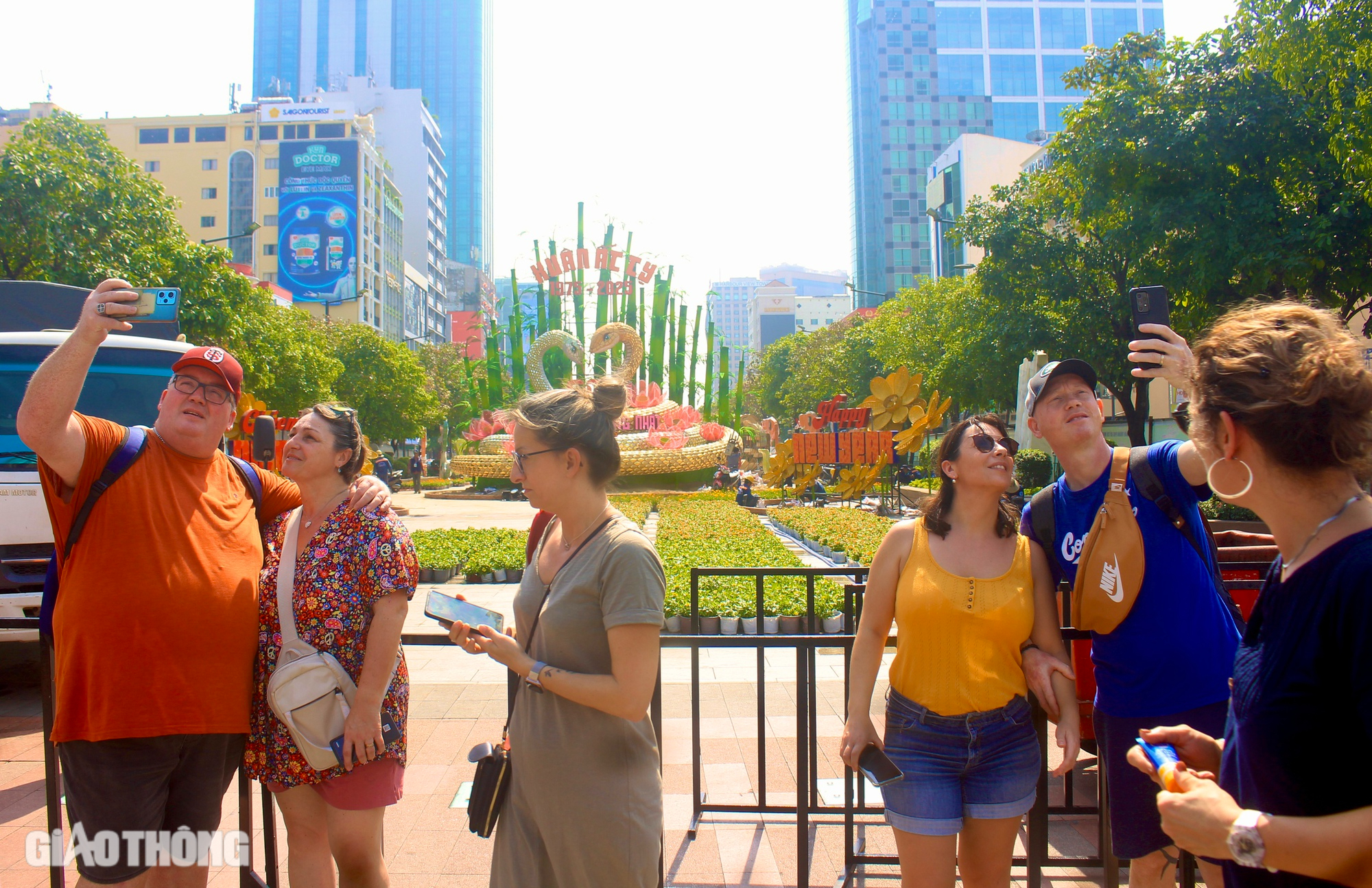 Rất nhiều đoàn du khách nước ngoài tham quan khu vực trung tâm TP.HCM cũng nán lại chụp hình lưu niệm với cặp rắn Kim Tỵ và Ngân Tỵ tại đường hoa.