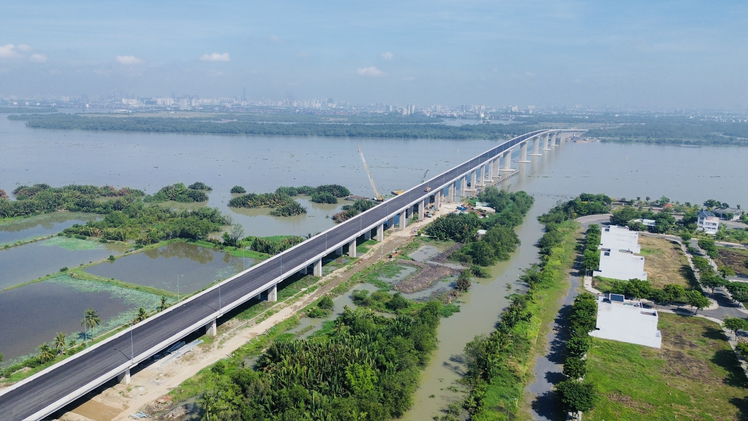 Ghi nhận tại công trường, cầu Nhơn Trạch đã nối liền đôi bờ sông giữa TP.HCM và Đồng Nai. Cây cầu như dải lụa thép mềm mại, kết nối liền mạch từ điểm đầu (giao cắt với tỉnh lộ 25B thuộc địa phận huyện Nhơn Trạch, tỉnh Đồng Nai) đến khu vực giao dự án Vành đai 3 TP.HCM.