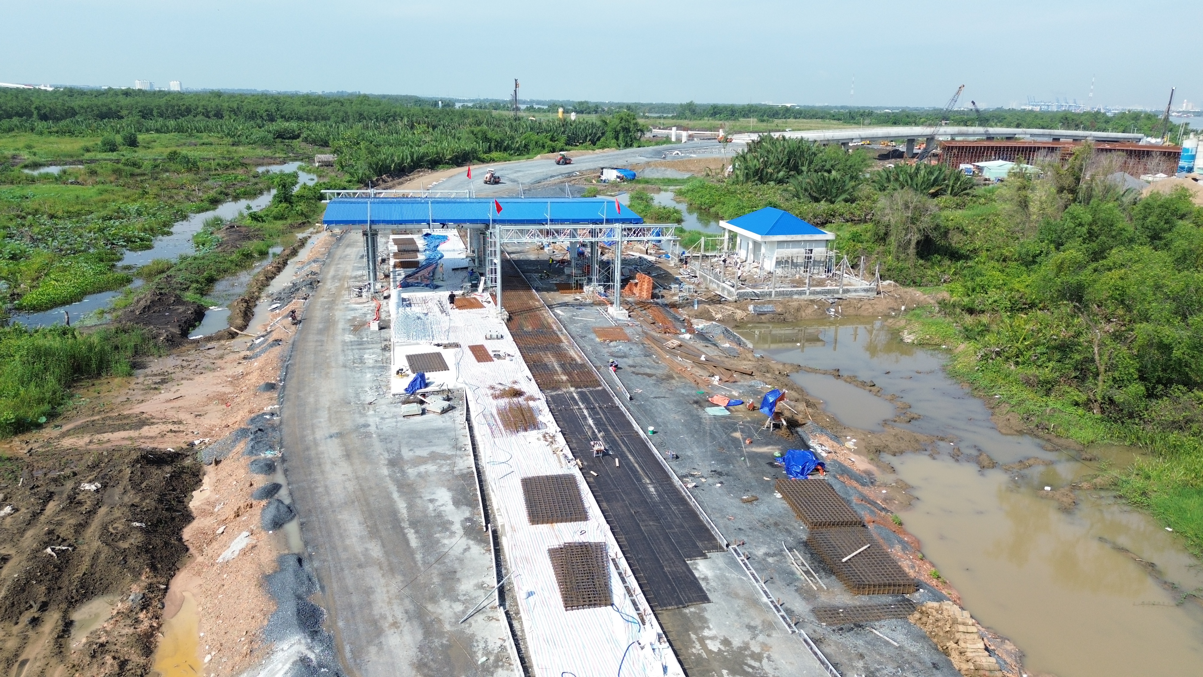 Khó khăn lớn nhất hiện nay chính là thời tiết. Thời gian qua, nhiều trận mưa lớn kéo dài ảnh hưởng đáng kể những công đoạn cần thi công trong điều kiện khô ráo, đặc biệt là trải thảm bê tông nhựa. Trong ảnh, trạm thu phí đặt gần khu vực đường dẫn lên cao tốc TP.HCM - Long Thành - Dầu Giây đang trong giai đoạn hoàn thiện, các công đoạn cuối cùng dự kiến hoàn thành những ngày tới.