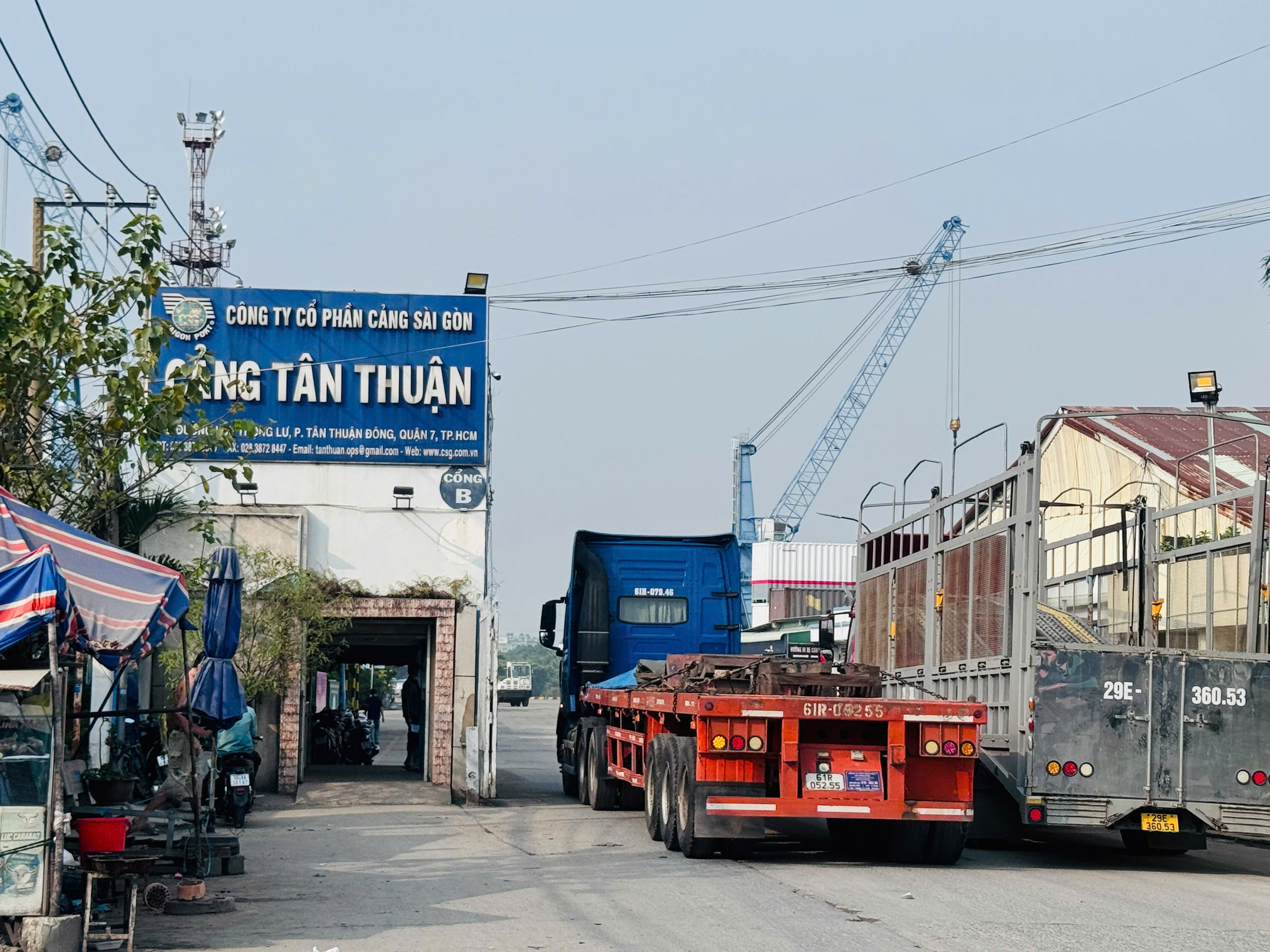 Tuyến đường Huỳnh Tấn Phát - Lưu Trọng Lư, trục kết nối trực tiếp vào cảng Tân Thuận, vốn nhỏ hẹp nhưng mỗi ngày phải “gồng mình” gánh lượng lớn xe container, xe tải nặng ra vào không ngơi nghỉ. Dòng xe nặng nối đuôi từ sáng sớm đến khuya, khiến không gian nơi đây thường xuyên phủ một lớp bụi xám, bám kín nhà cửa, hàng quán và cả những lối đi sinh hoạt của người dân xung quanh.