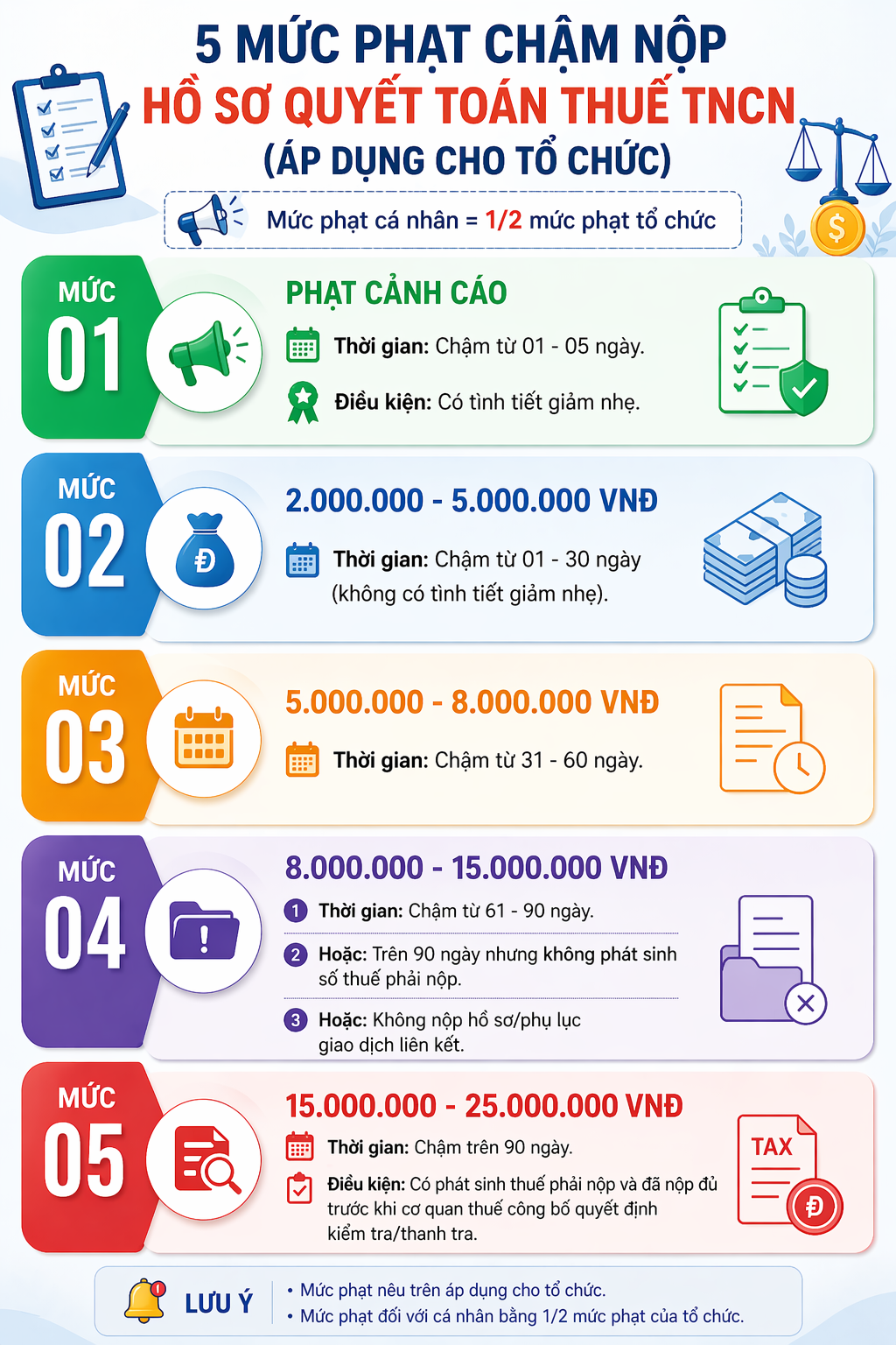 Mức xử phạt đối với hành vi chậm nộp hồ sơ quyết toán thuế thu nhập cá nhân được quy định tại Điều 13 Nghị định 125/2020/NĐ-CP, đã được sửa đổi, bổ sung theo khoản 10 Điều 1 Nghị định 310/2025/NĐ-CP, cụ thể như sau: