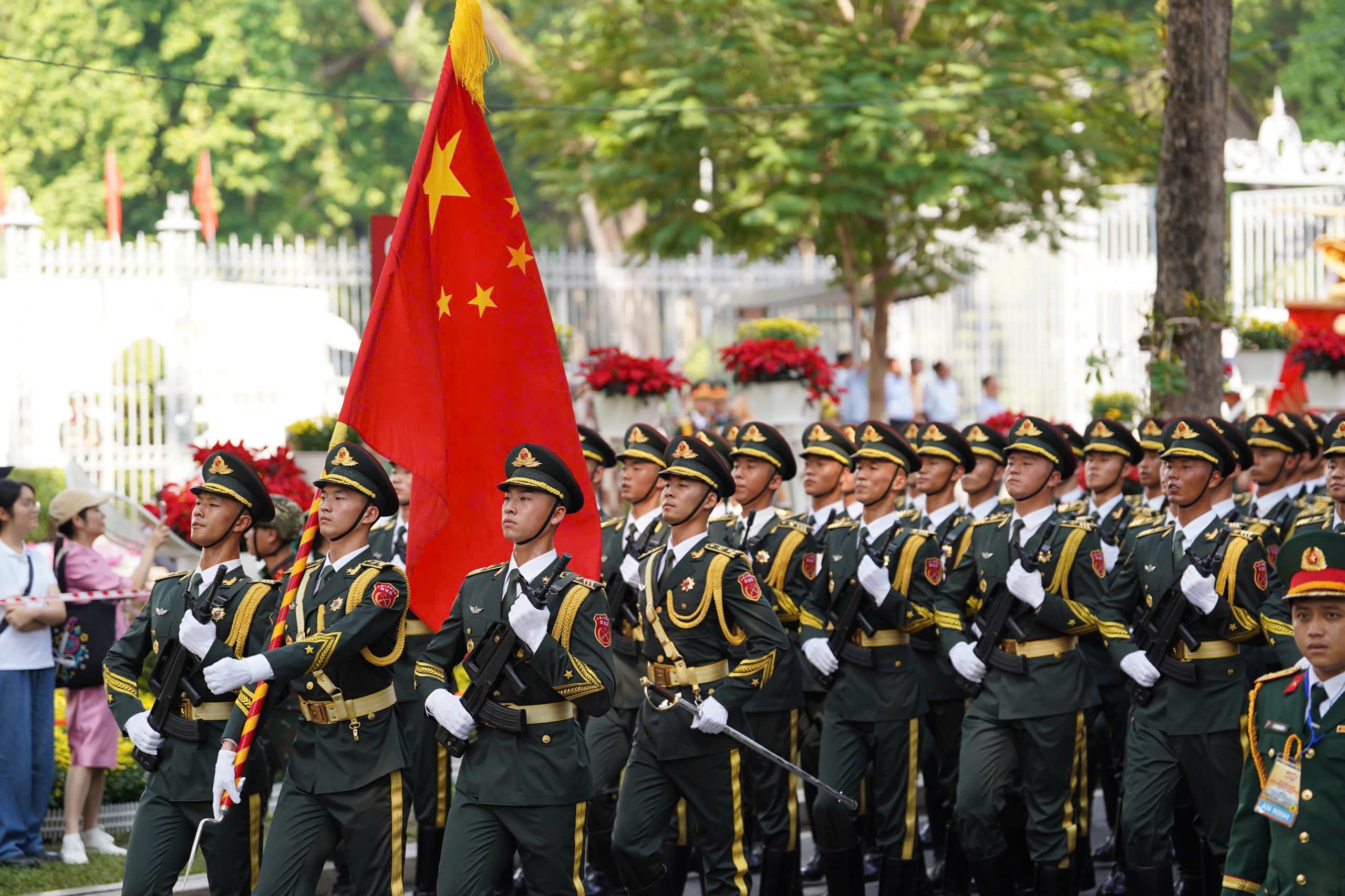 Trong lễ chào cờ trang nghiêm tại buổi tổng duyệt, 21 loạt đại bác được bắn vang rền.