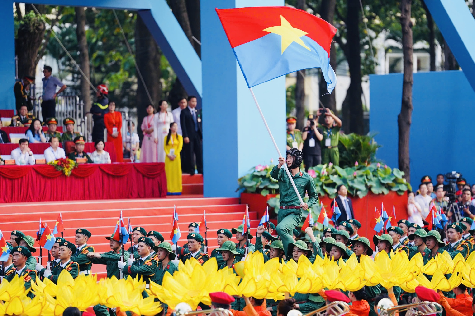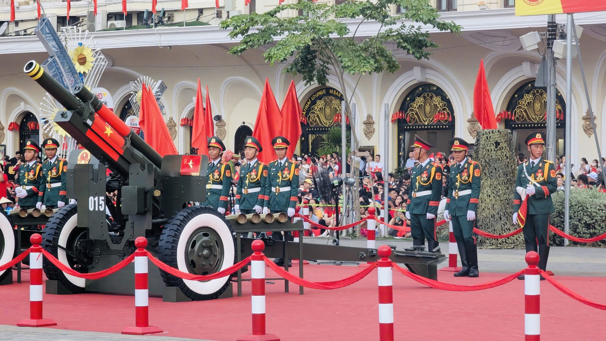 Khoảng 6h30 sáng, chương trình nghệ thuật mở màn lễ tổng duyệt chính thức bắt đầu. Tiếng trống hội rộn rã, cờ hoa rực rỡ khắp các tuyến đường trung tâm TP.HCM.