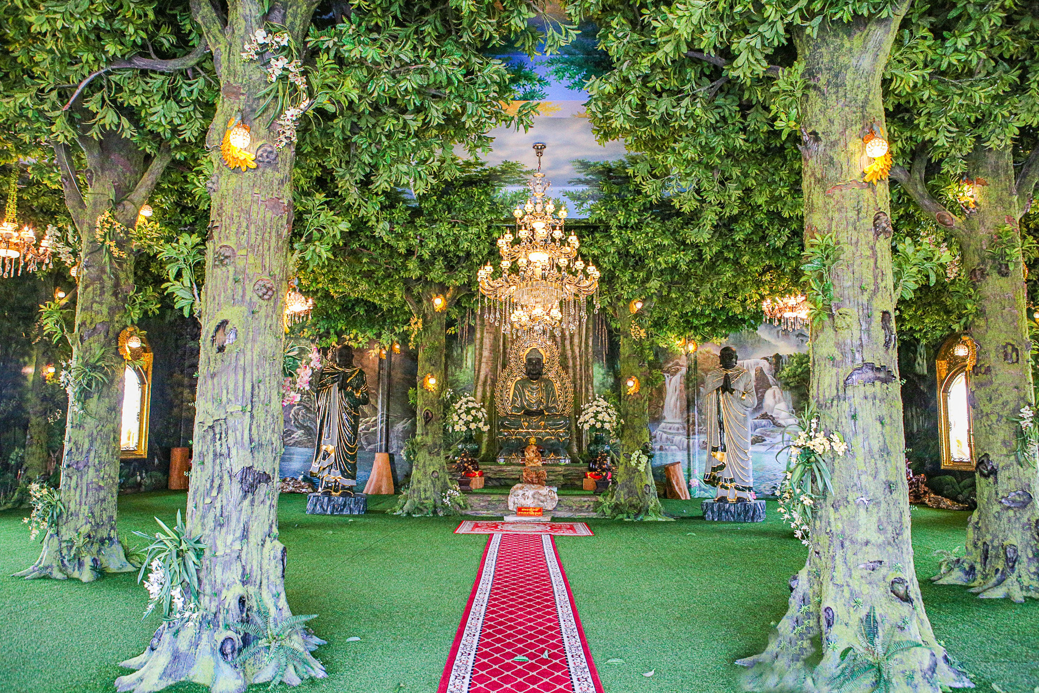 Khu vực tầng 1 được thiết kế với 3 pho tượng lớn và nhiều cây xanh xung quanh, tạo nên khung cảnh yên bình, tĩnh lặng.
