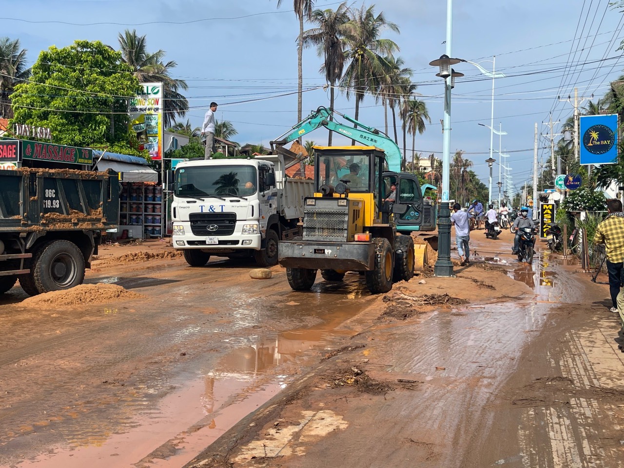 Đến trưa 21/5, các lực lượng dân phòng, công an, bộ đội, Sở GTVT đang khẩn trương khắc phục sự cố sạt lở dọn bùn, cát tràn xuống trên đường Huỳnh Thúc Kháng ở Mũi Né, Phan Thiết.
