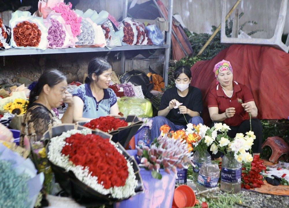 Nhiều tiệm hoa phải tăng nhân viên để chuẩn bị hoa tươi giao cho khách dịp 20/10. Chị Hoa, nhân viên tiệm hoa tại chợ Quảng An, kể rằng mấy hôm nay đều không được ngủ do đơn đặt hàng tăng gấp đôi so với năm ngoái.