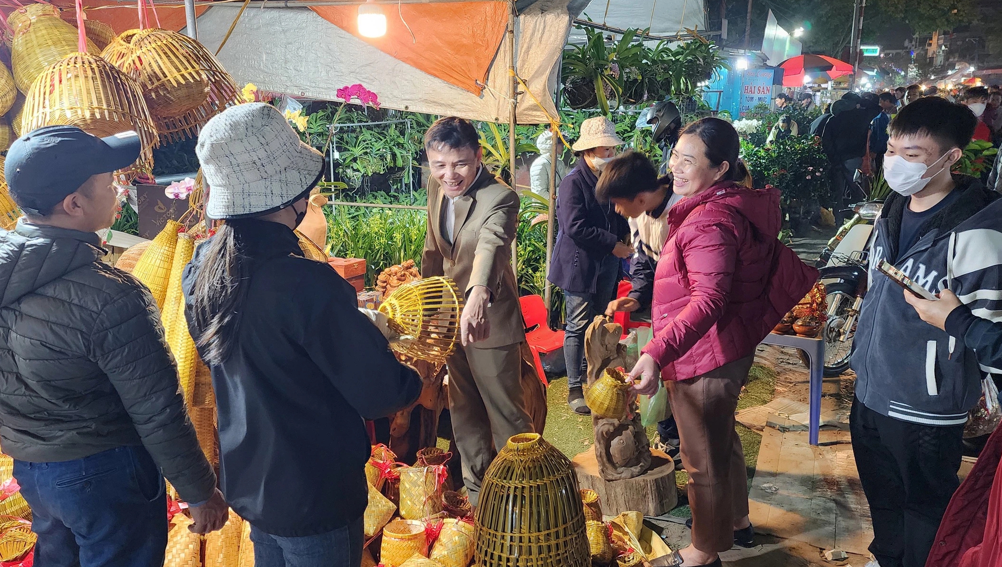 Càng về khuya, lượng người đổ dồn về chợ Viềng càng đông. Anh Tú, đến từ TP Ninh Bình cho biết, năm nào anh cũng đi chợ Viềng từ chiều mùng 7 đến sáng mùng 8 mới trở về nhà. "Đi chợ Viềng không chỉ có ý nghĩa mua may bán rủi, mà tôi còn thích thú được hoà mình vào không khí đông đúc, tấp nập của lễ hội đầu năm", anh Tú chia sẻ.
