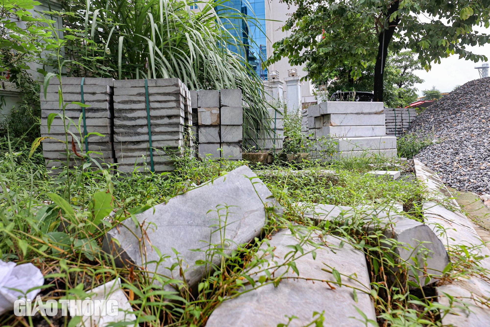 Đá lát vỉa hè được tập kết lâu ngày, cỏ dại mọc um tùm nhưng chưa thể thi công.