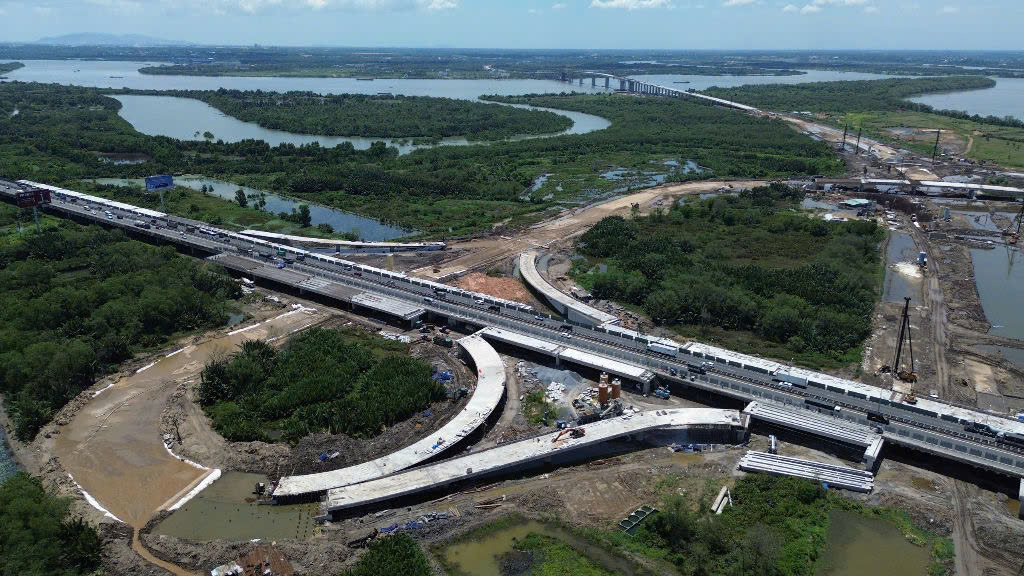 Không chỉ riêng cầu Nhơn Trạch, những cây cầu khác trên tuyến như cầu Rạch Chạy, hệ thống cầu cạn tại nút giao cao tốc TP.HCM - Long Thành - Dầu Giây cũng đang thi công hết tốc lực (Trong ảnh là đoạn nút giao với cao tốc TP.HCM - Long Thành - Dầu Giây).