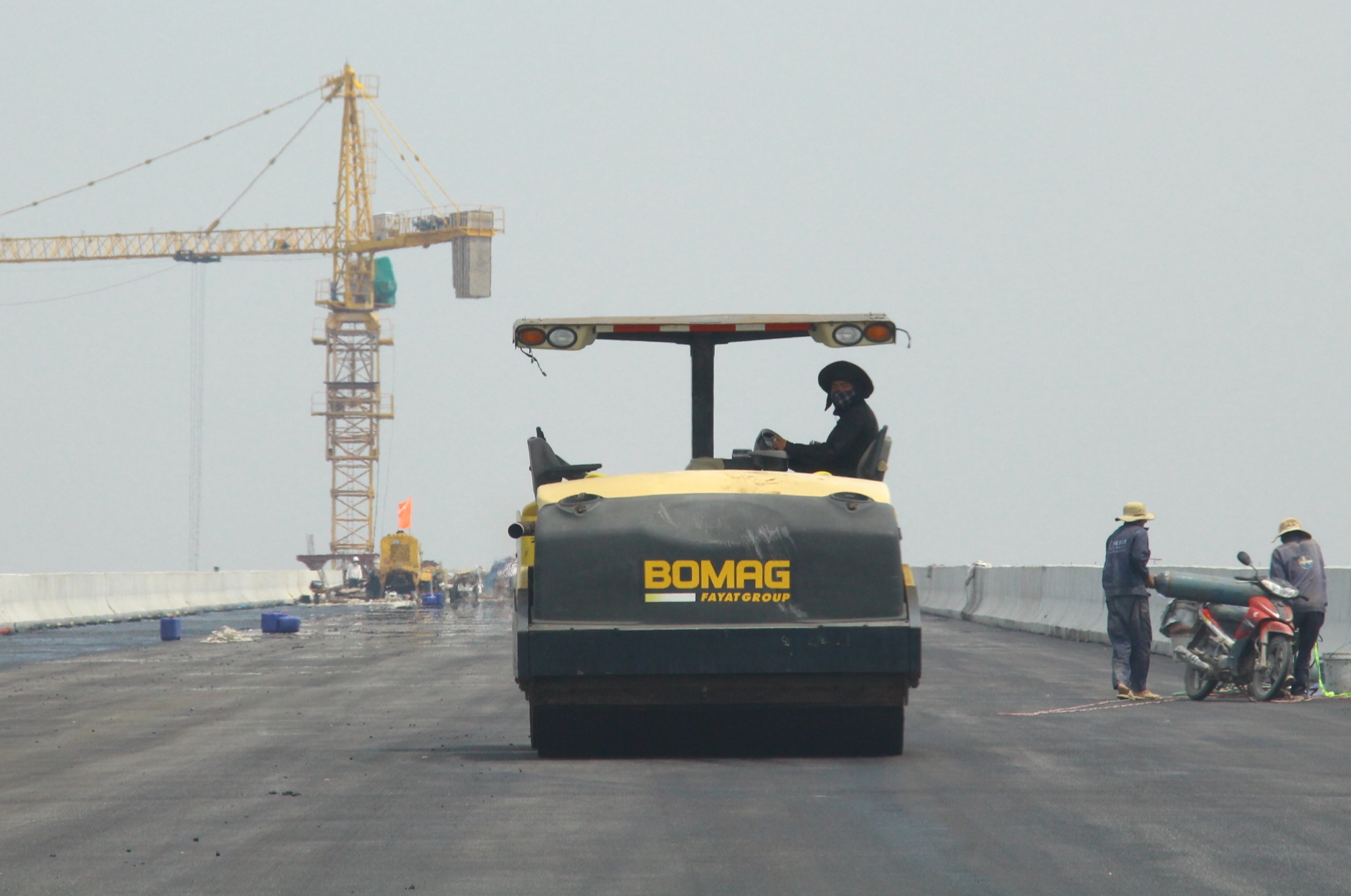 Tất cả đang chạy đua với thời gian, gấp rút hoàn thiện những hạng mục cuối cùng để kịp đưa cầu Nhơn Trạch và đường dẫn thông xe kỹ thuật vào ngày 27/4, sớm hơn tới 4 tháng so với kế hoạch ban đầu (Trong ảnh công nhân đang tập trung lu nền, thảm nhựa).