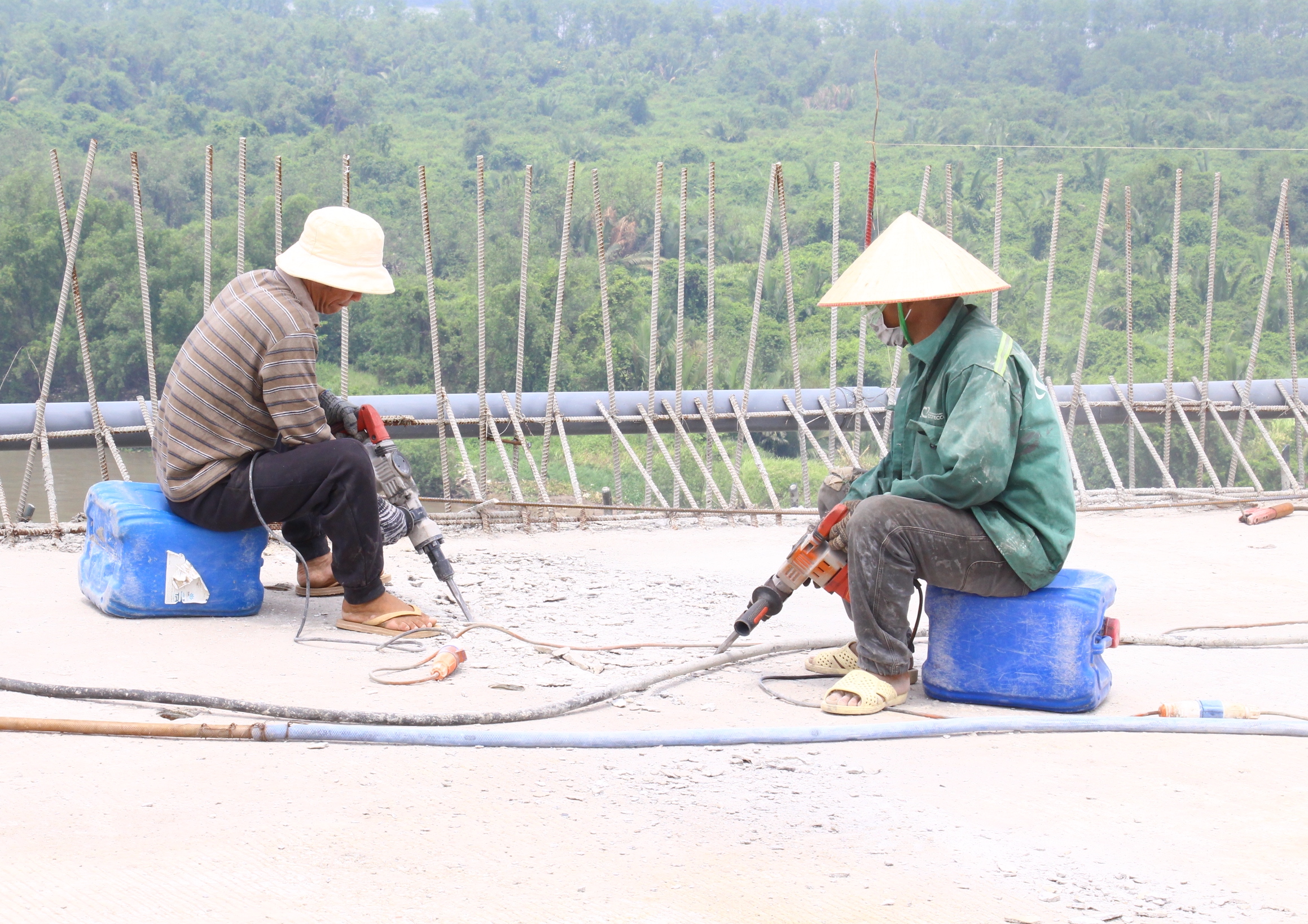 Tương tự công nhân Nguyễn Văn Tuần đang đo cắt tấm lưới để thi công cho biết, do rút ngắn thời gian hoàn thành nên khối lượng công việc rất nhiều, do đó anh em phải ăn vội, ngủ vội để làm việc dẫu vất vả nhưng nhìn cầu và đường đang tiến gần hơn đến ngày hoàn thành nên ai cũng vui.