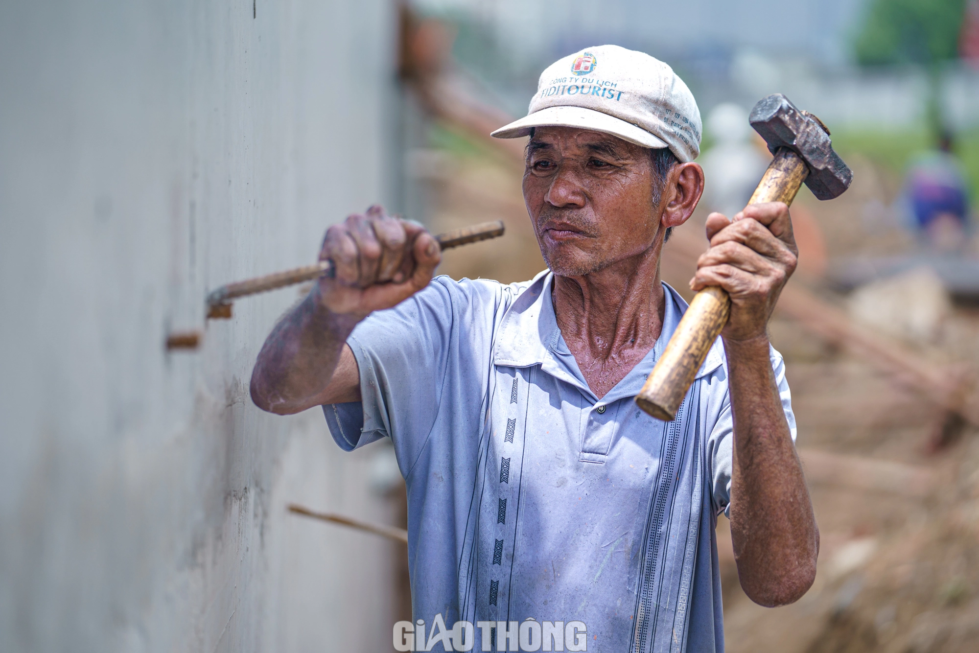 Ông Ba Dìn, công nhân công trường đang đục lỗ để trám lỗ bê tông trên tường hầm chui số 2. Ông Dìn cho biết mỗi ngày ông đều làm việc 8 tiếng. Có những ngày mưa lớn, không thi công được thì phải tăng ca thêm ca tối để hoàn thành đủ khối lượng công việc mỗi ngày nhà thầu đặt ra.