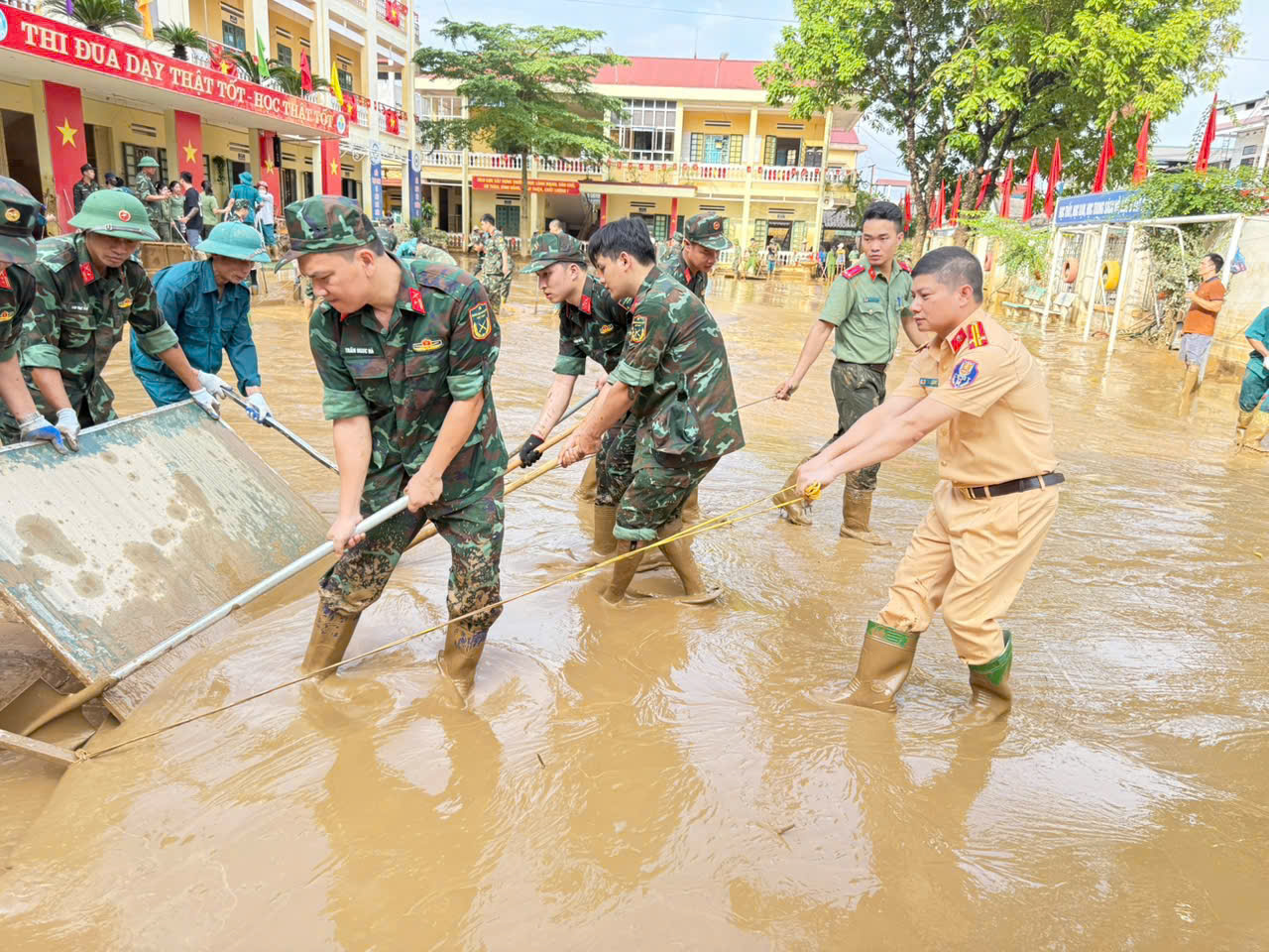 Theo ghi nhận PV Báo Xây dựng trước, trong, sau lũ, lực lượng CSGT Lào Cai có mặt trên nhiều tuyến đường như Nguyễn Thái Học, Trần Quốc Toản, Thanh Niên của phường Yên Bái. các cán bộ chiến sỹ miệt mài dọn dẹp những lớp bùn dày 40 - 50cm, rác thải, cây cối, đồ đạc từ các nhà dân trôi dạt chất đống bên đường.