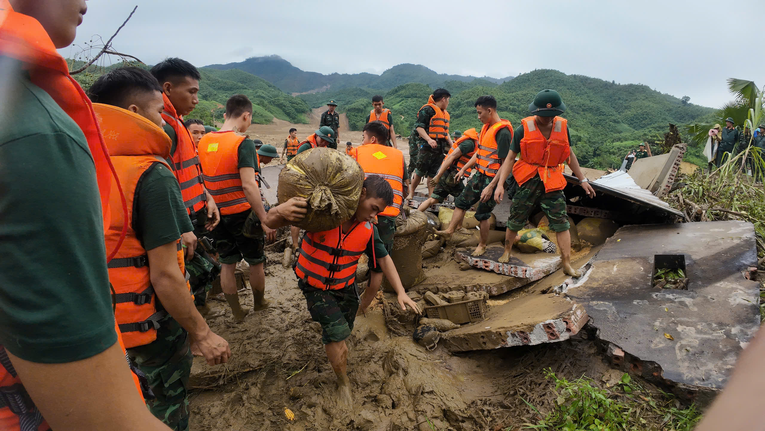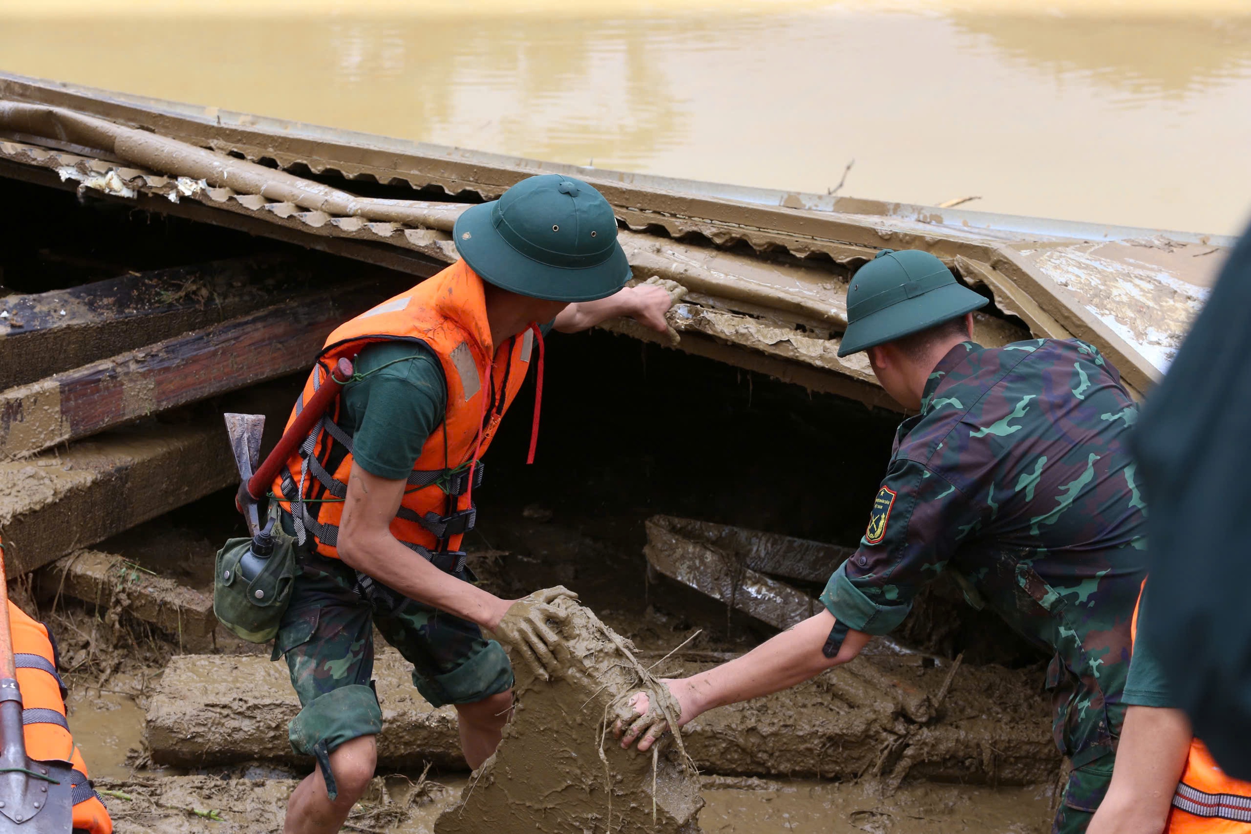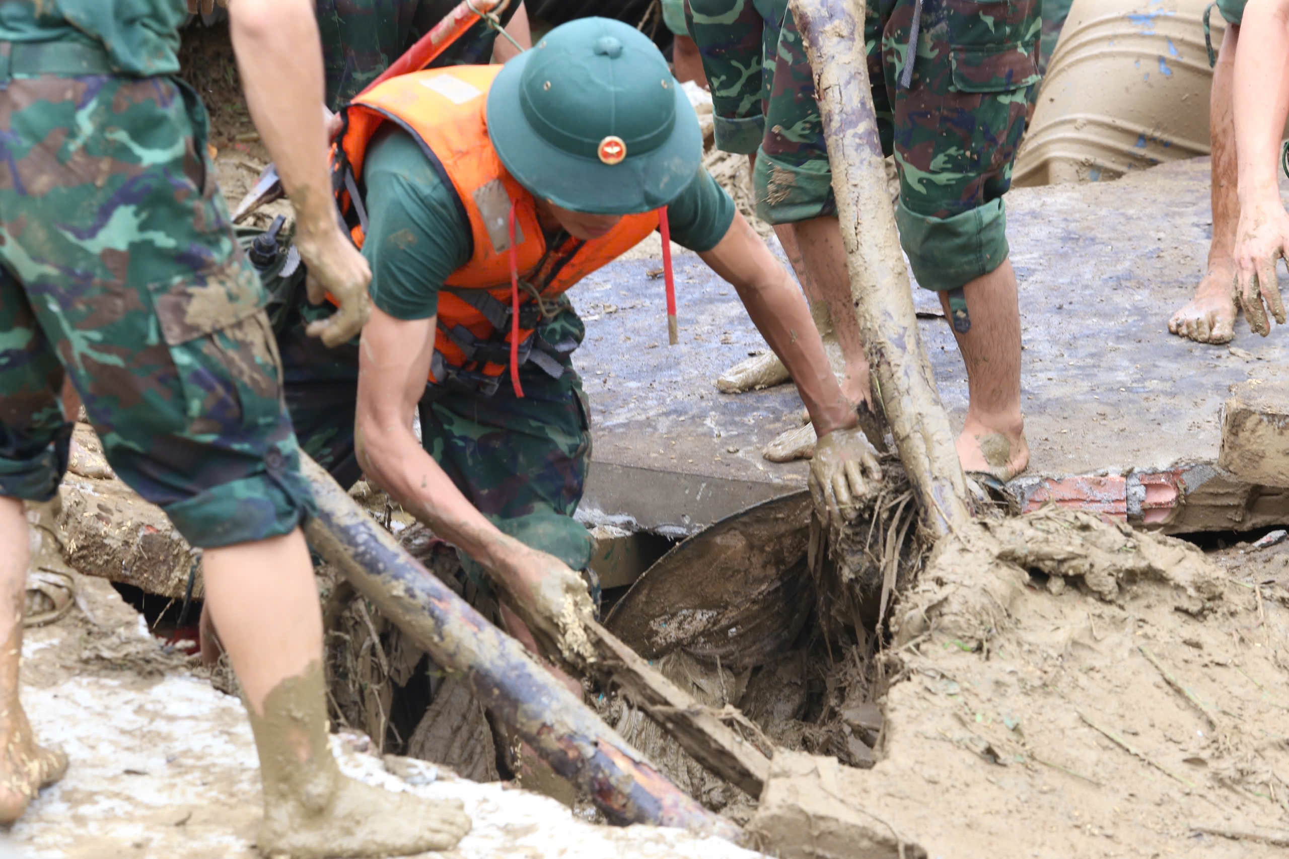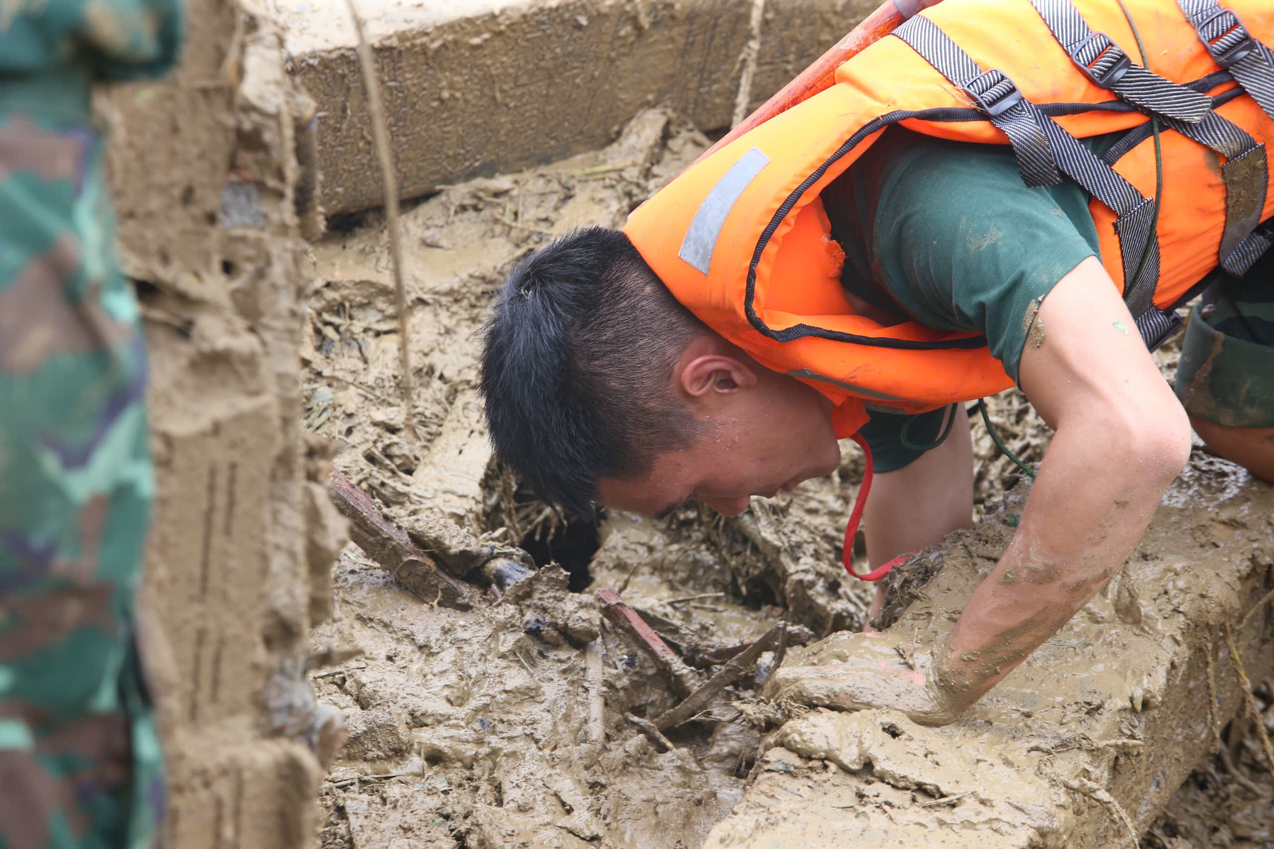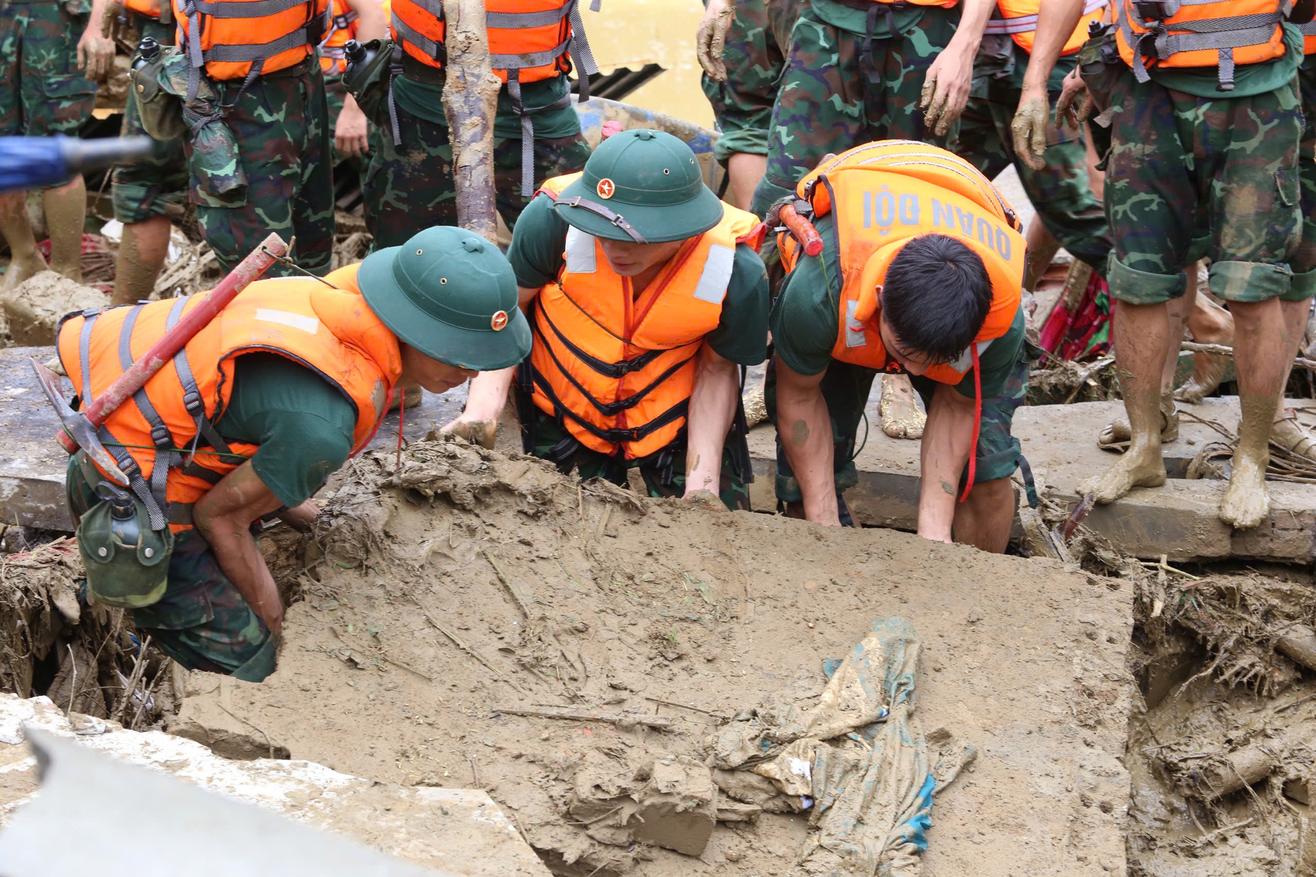 Bộ đội mò dưới bùn đất tìm kiếm nạn nhân.