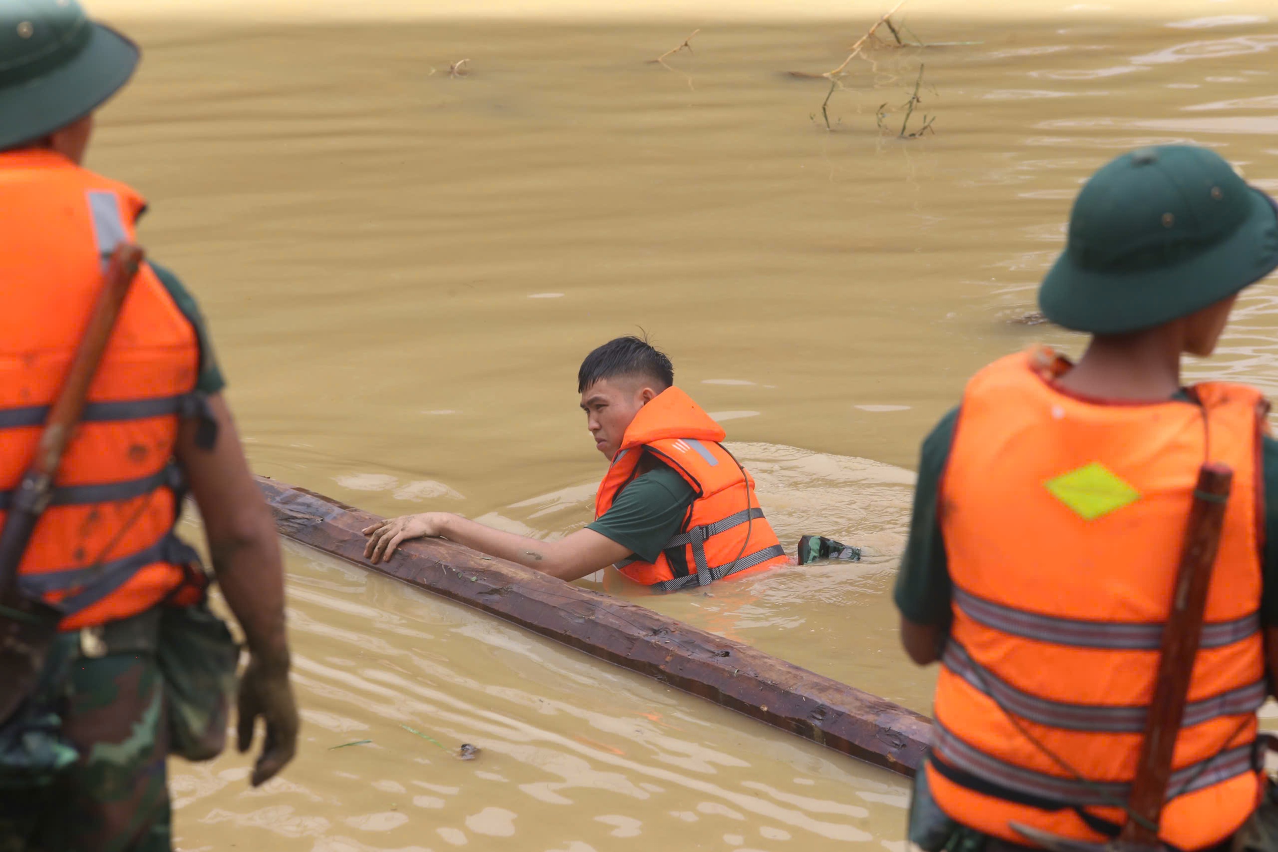 Các chiến sĩ lặn ngụp dưới nước để tìm kiếm tại các khu vực ngập nước.