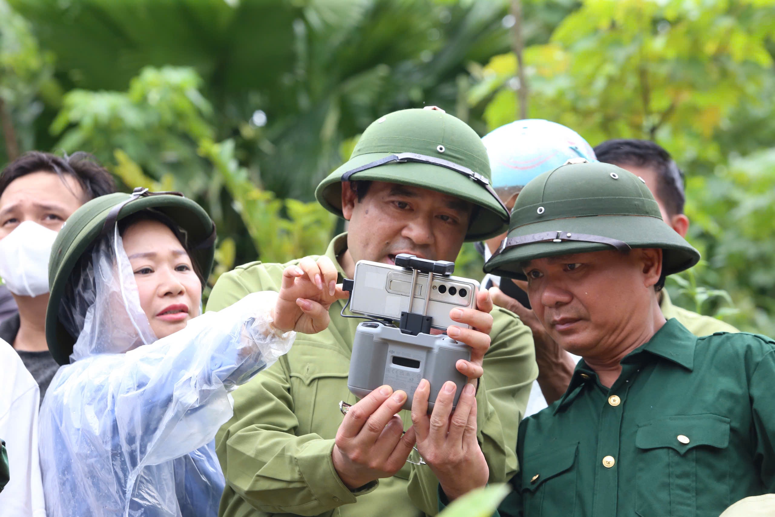 Chủ tịch UBND tỉnh Lào Cai Trịnh Xuân Trường cầm flycam quan sát từ trên cao để chỉ đạo công tác tìm kiếm.