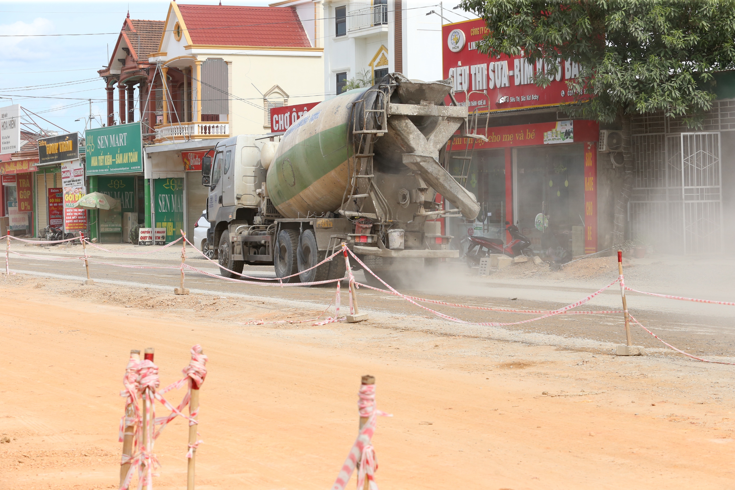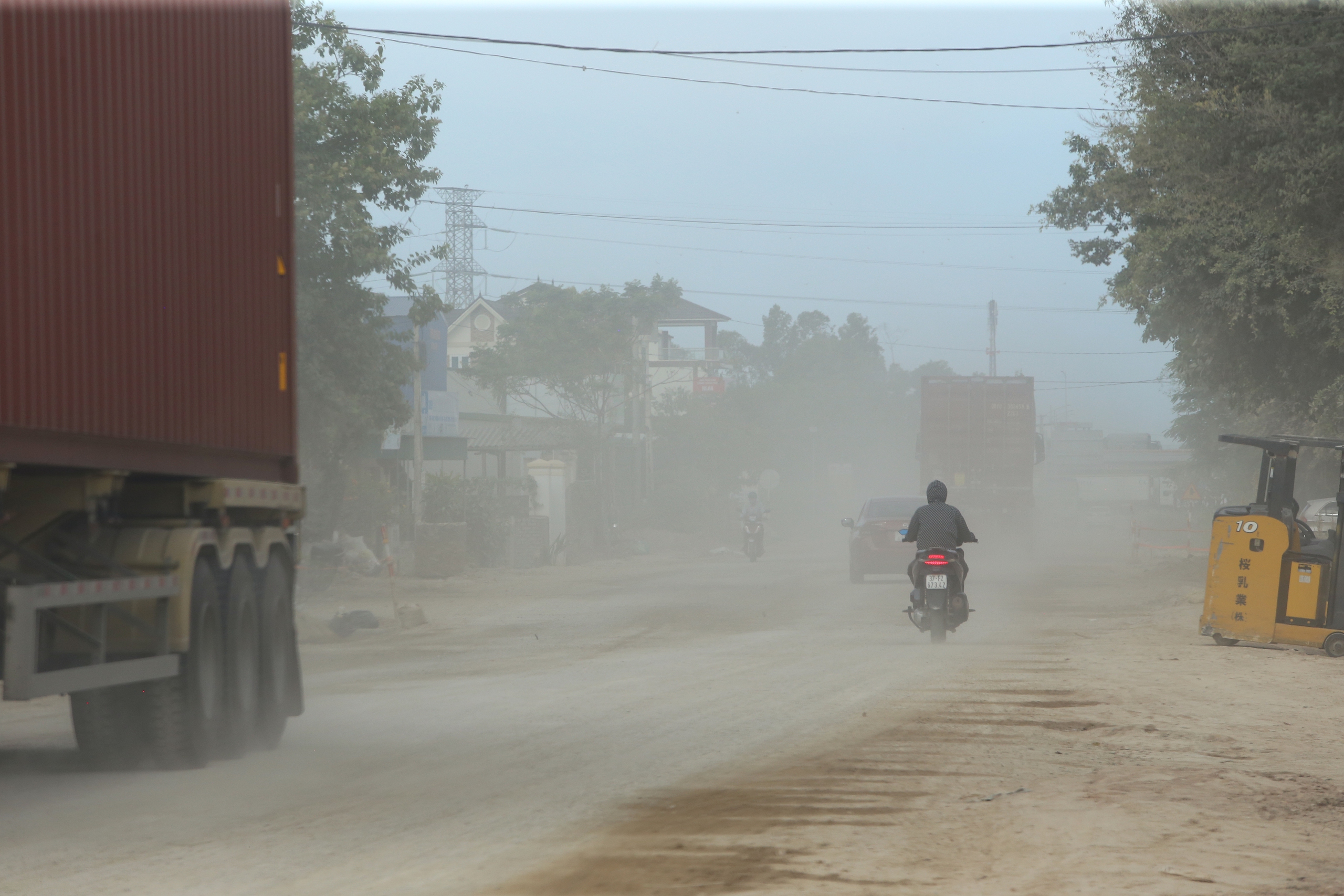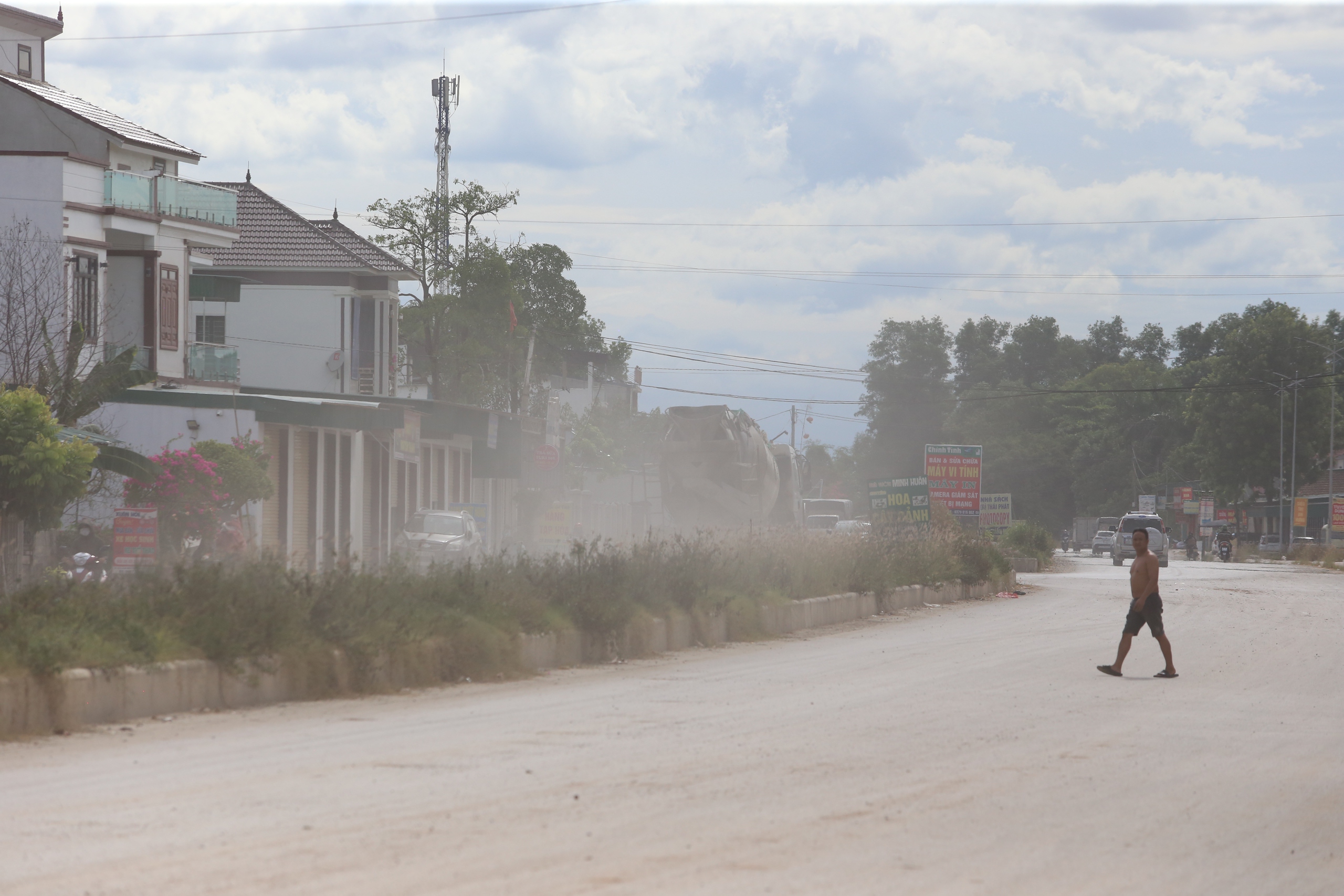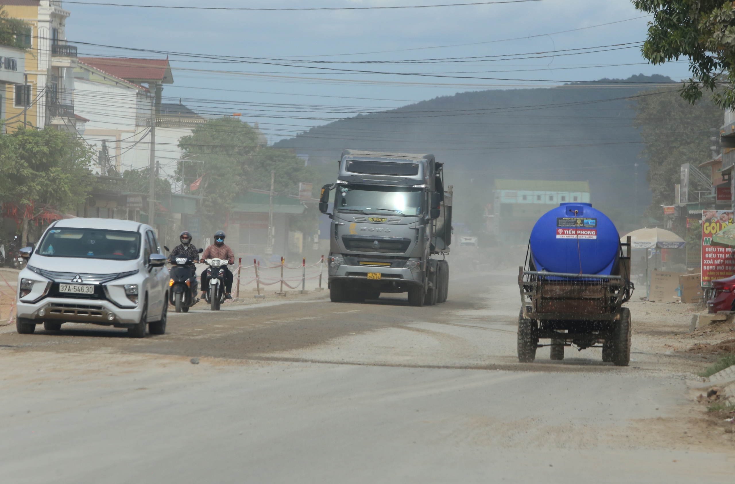 “Kinh hoàng, hôm trước tôi đi xe máy từ xã Diễn Cát xuống thị trấn Diễn Châu. Tại những vị trí chưa có mặt bằng, mỗi lần có xe tải lớn, xe khách đi qua là bụi thở không nổi, quần áo bạc phếch đất bụi”, anh Đặng Quế đang làm việc tại thị trấn Diễn Châu kể.