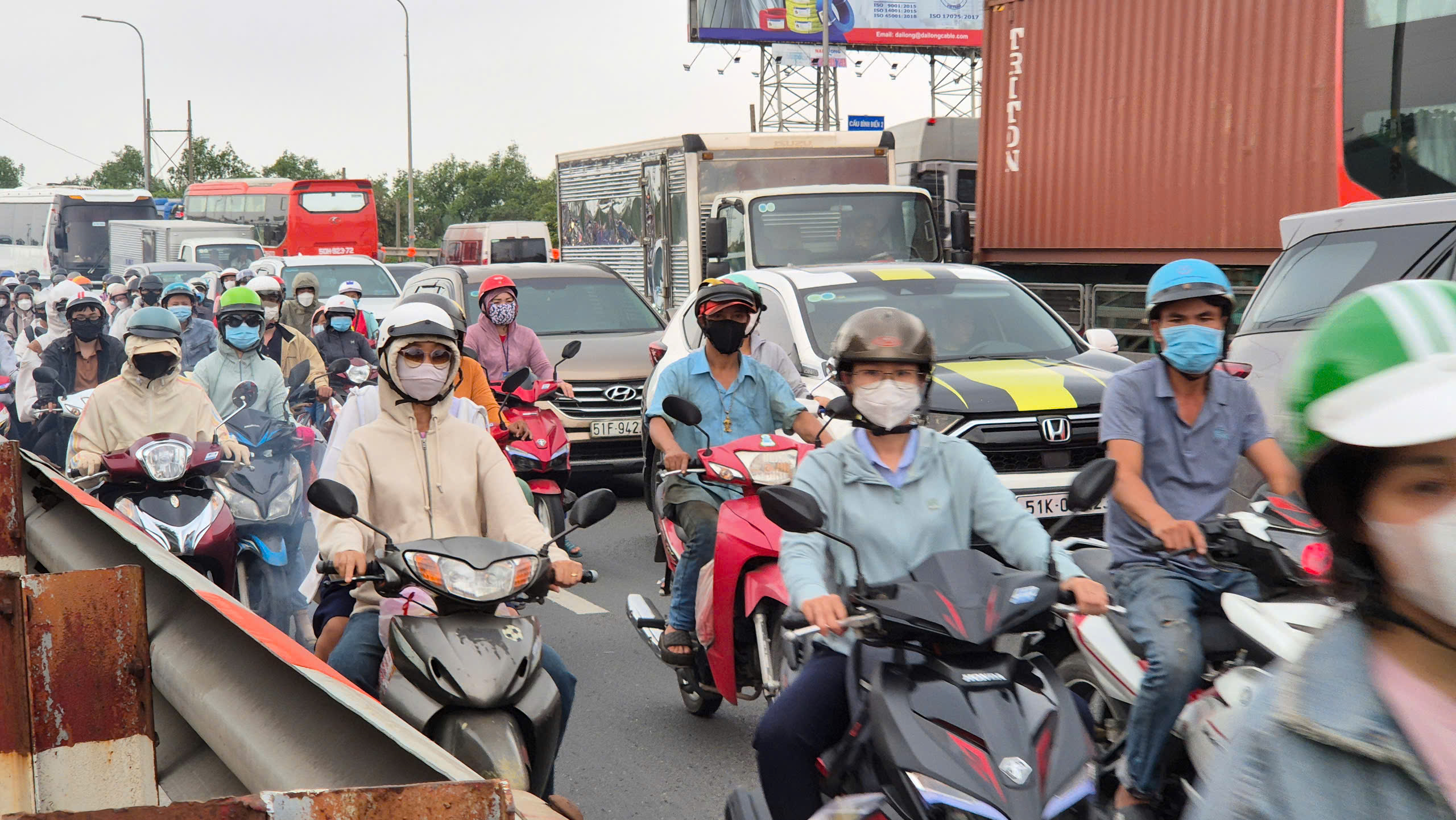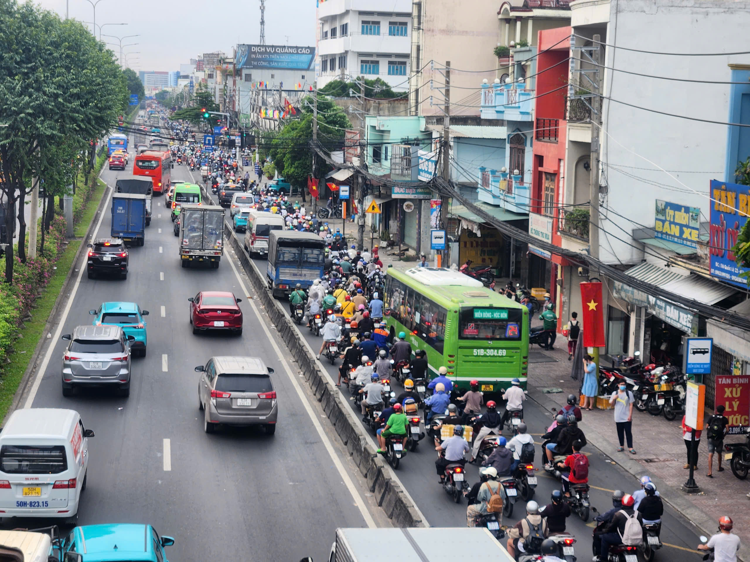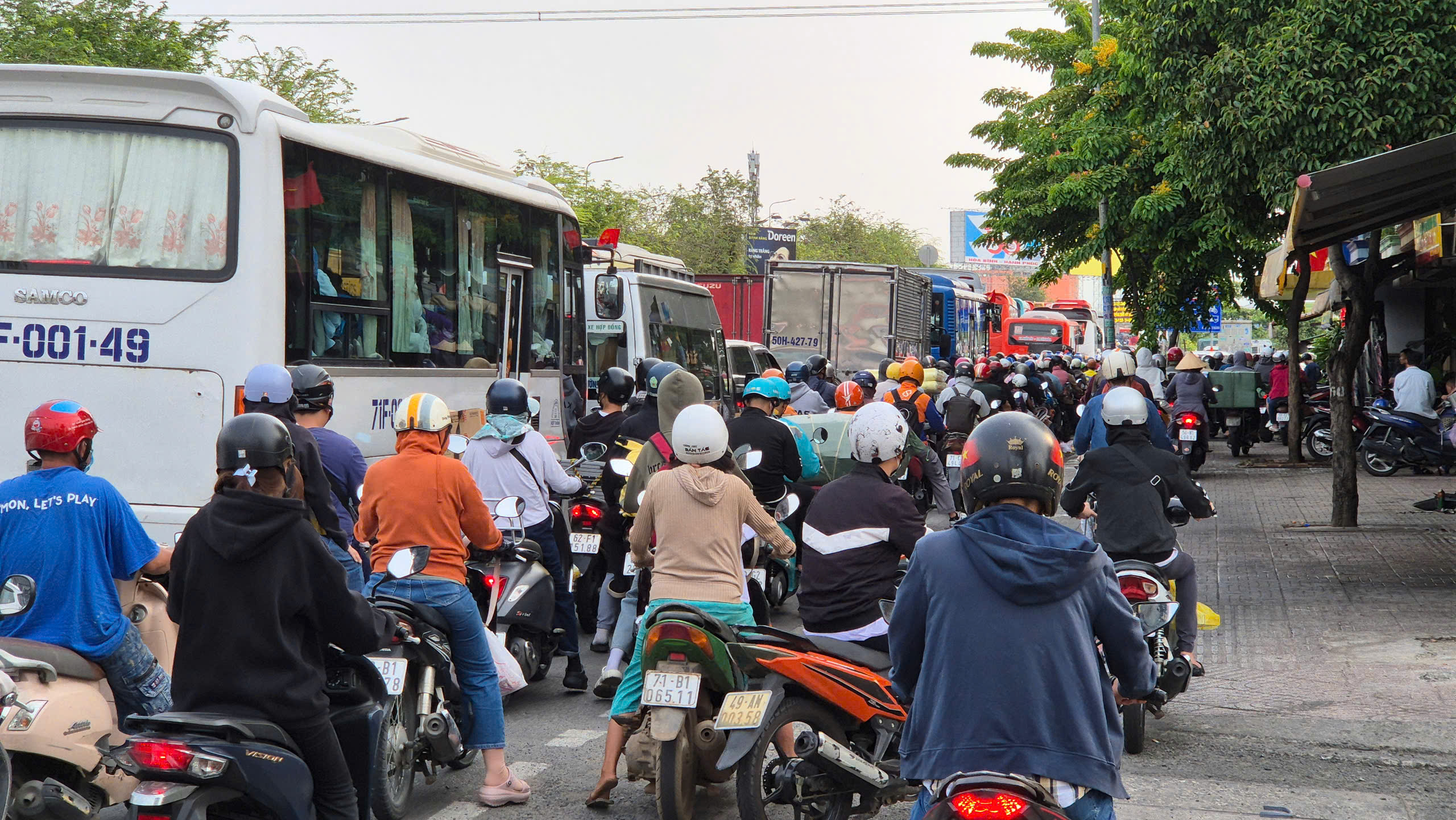 Trong số này, nhiều người vừa tan ca tranh thủ về quê sớm, phần lớn đi xe máy về các tỉnh lân cận như Long An, Tiền Giang, Bến Tre… Dọc tuyến quốc lộ 1, khung cảnh xe cộ nối đuôi nhau kéo dài hàng cây số. Trên đường, xe khách, xe tải, ô tô cá nhân chen chúc, len lỏi giữa dòng phương tiện đông nghẹt khiến tốc độ di chuyển nhiều lúc chỉ còn vài km/h.
