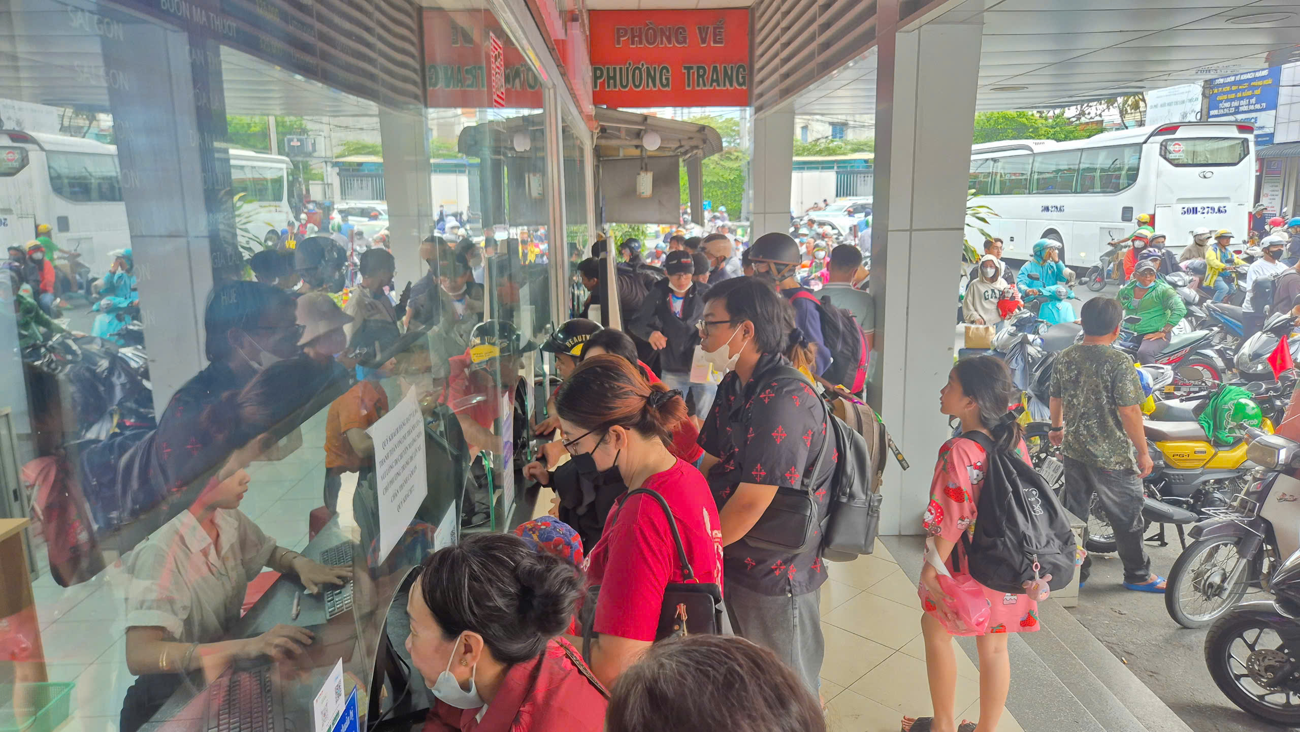 Tại các quầy vé, nhân viên làm việc liên tục, vừa tư vấn, vừa điều phối để tránh chen lấn. Bảng thông báo tuyến và giờ xuất phát được cập nhật liên tục.