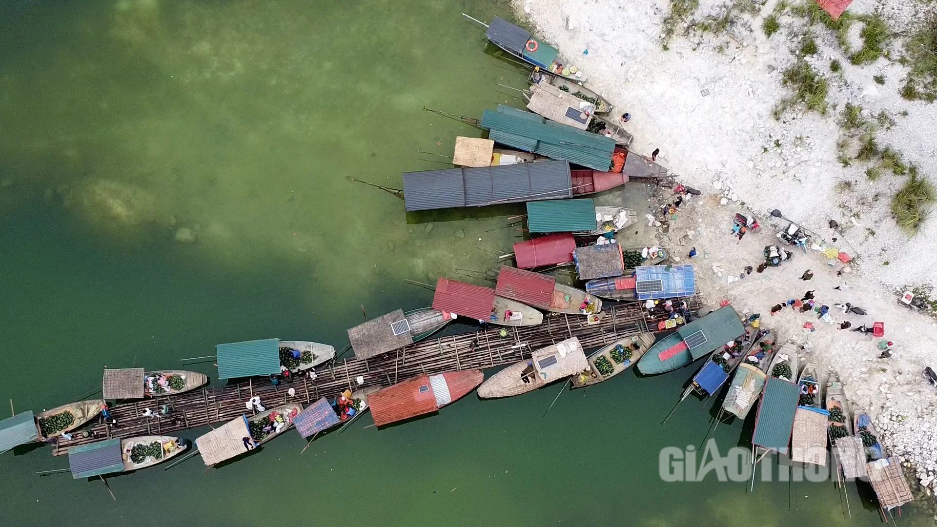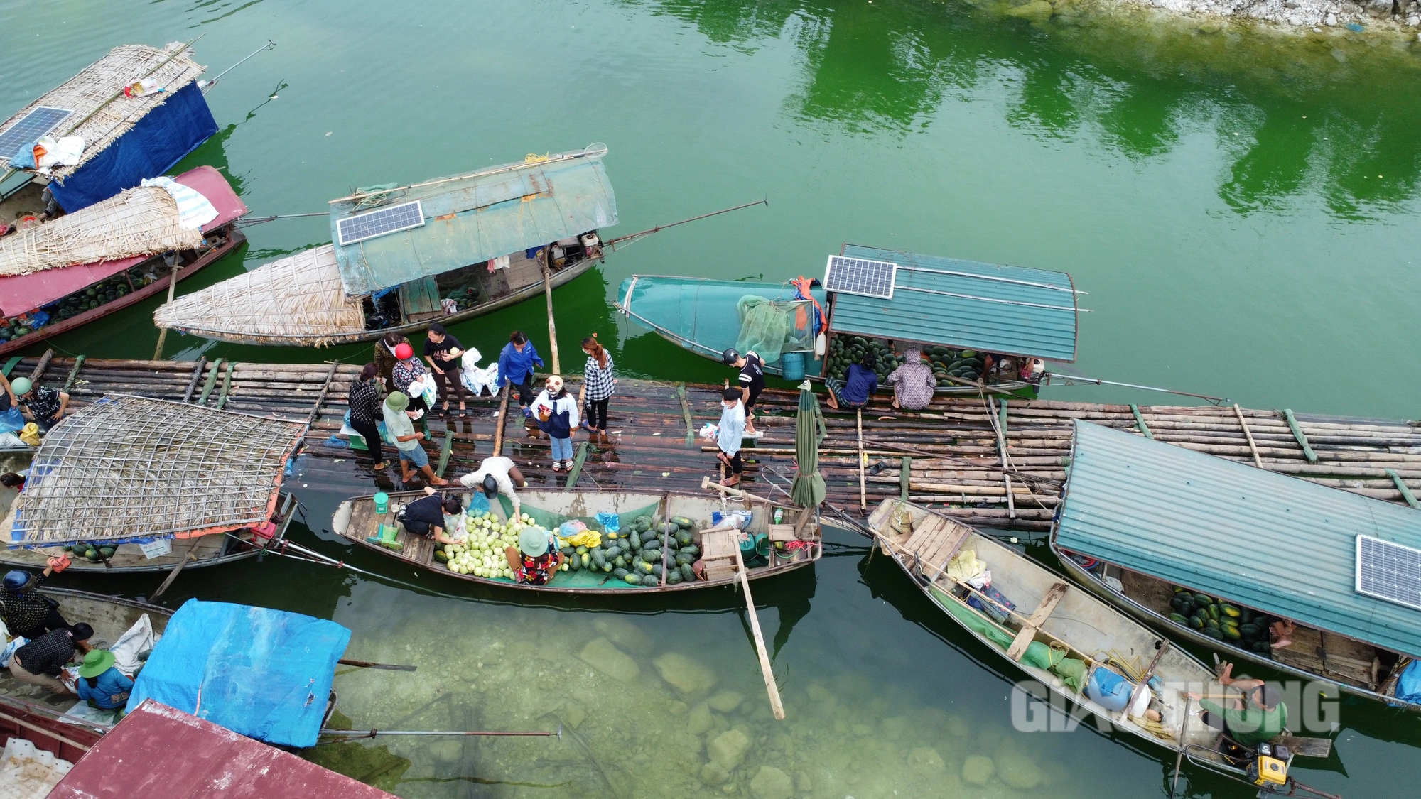 Bất chấp thời tiết nắng như đổ lửa, hàng dài thuyền nhỏ tập kết ven bờ hồ Thác Bà, khu vực xã Mông Sơn, huyện Yên Bình (Yên Bái) để bán các sản phẩm thu hoạch trên đảo.