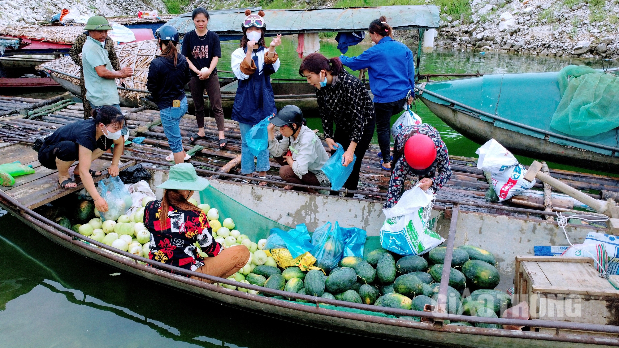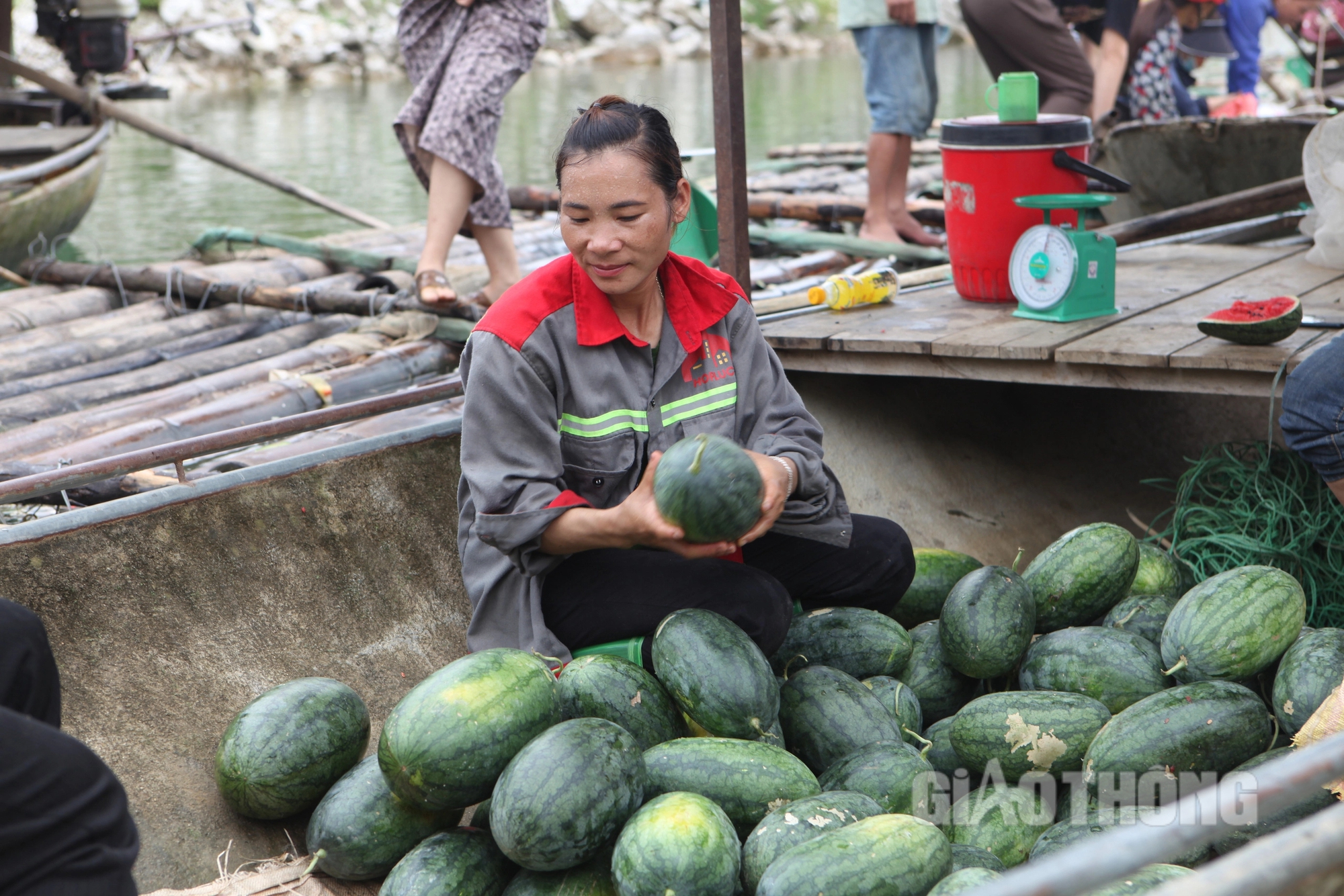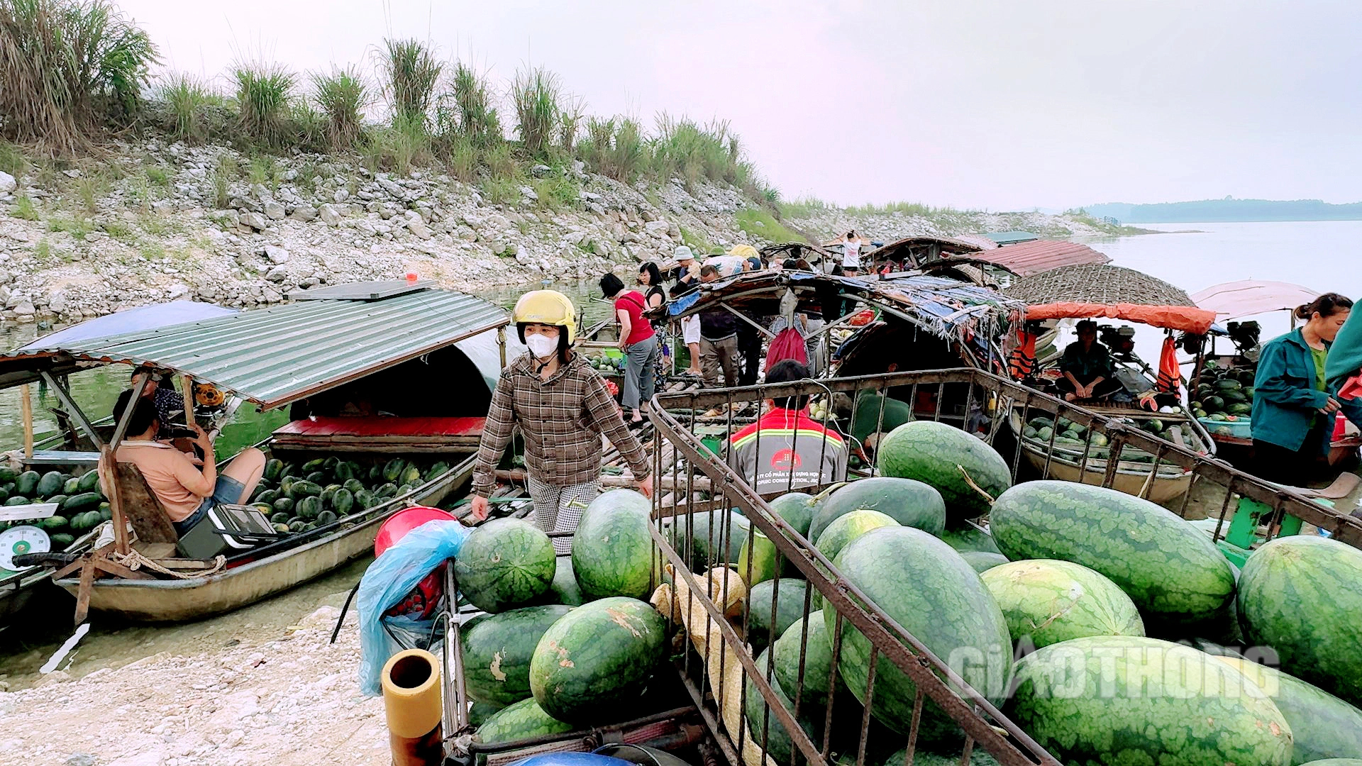 Những người dân vận chuyển dưa bằng những chiếc thuyền nan ra bán ở chợ nổi.