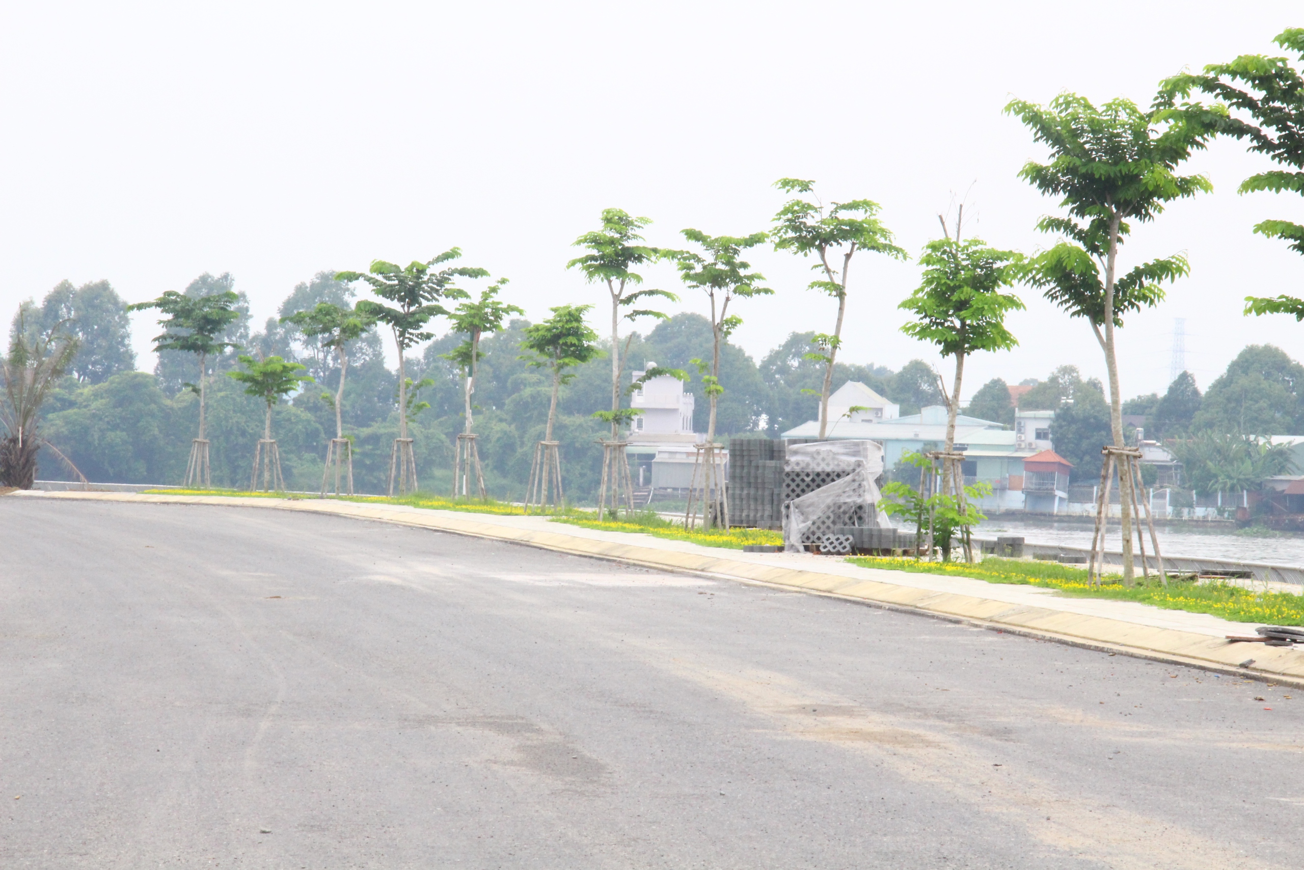 Hai bên vỉa hè cũng dần hoàn thiện, lát đá sạch sẽ, những hàng cây thân gỗ mới trồng đã xanh tốt, chạy dài theo bờ sông tạo bóng mát.