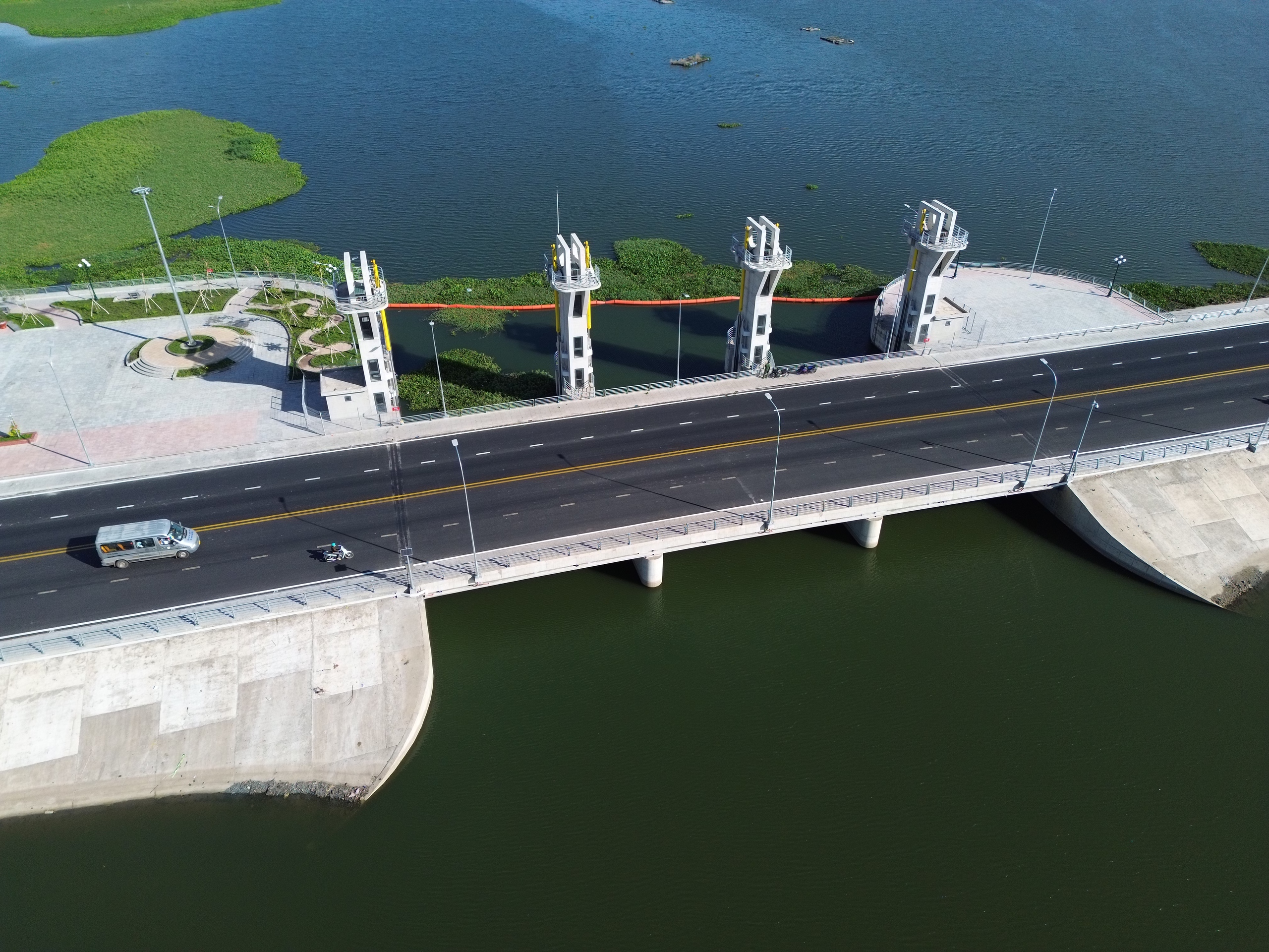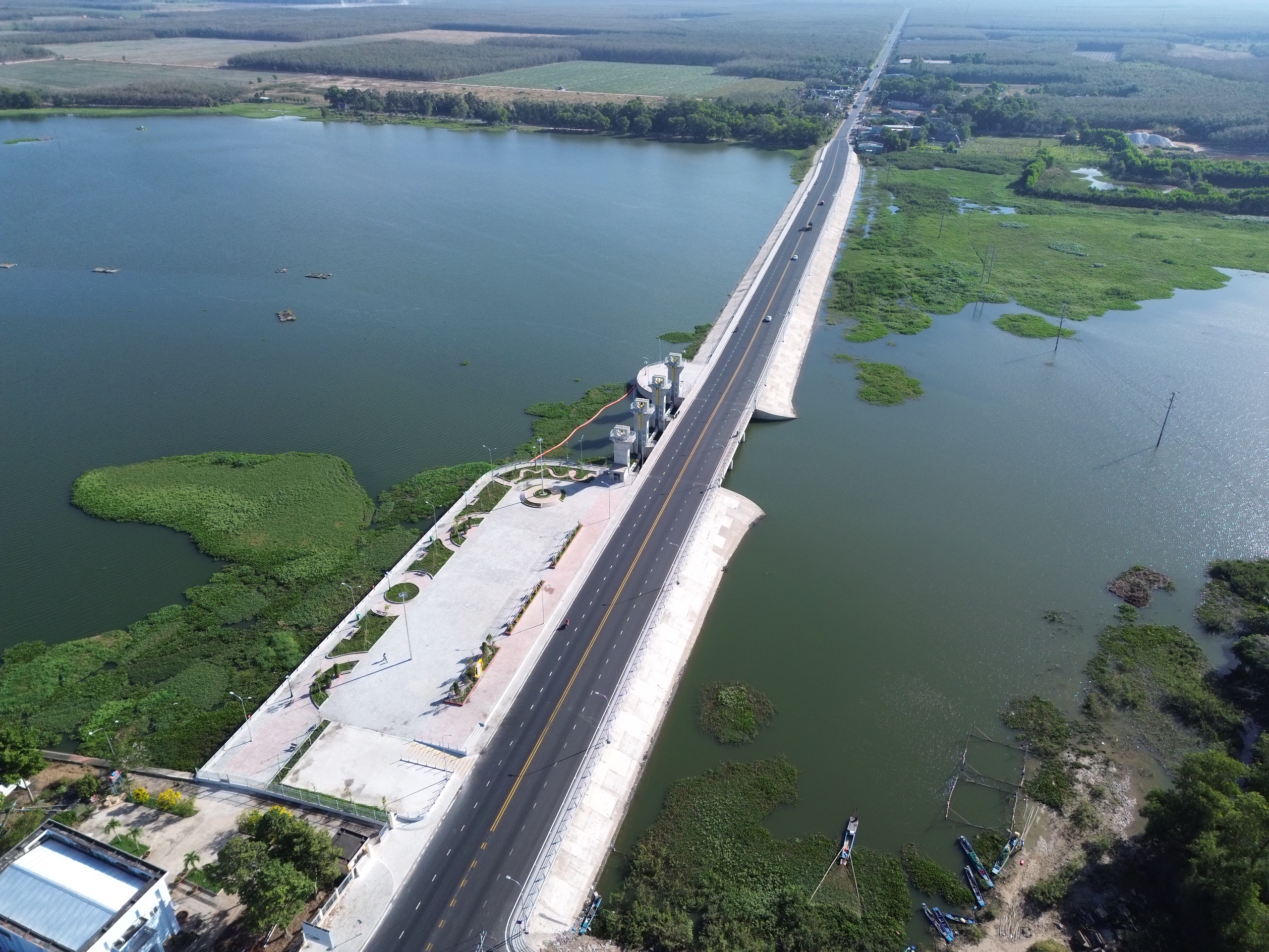 Phần đập chính là đường giao thông 4 làn xe băng ngang qua lòng hồ vừa được sơn, vạch kẻ đường, lắp hệ thống chiếu sáng hoàn chỉnh.