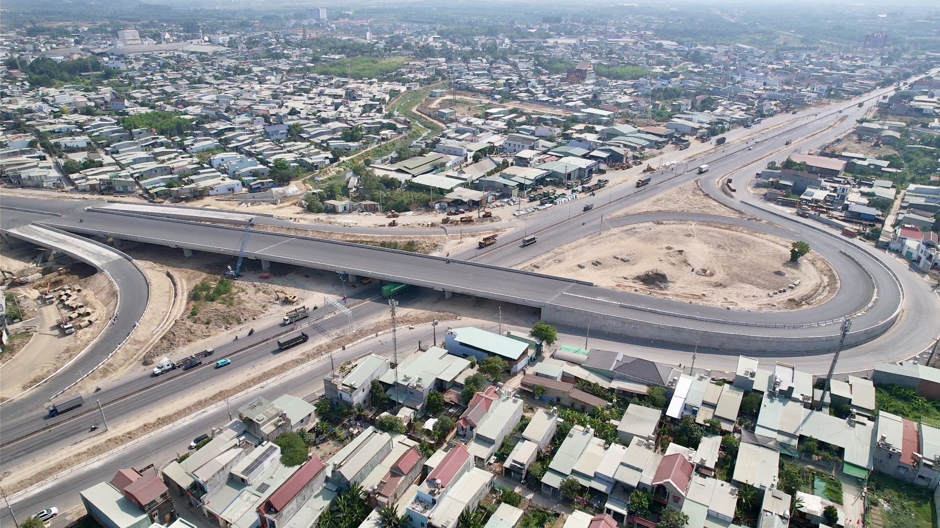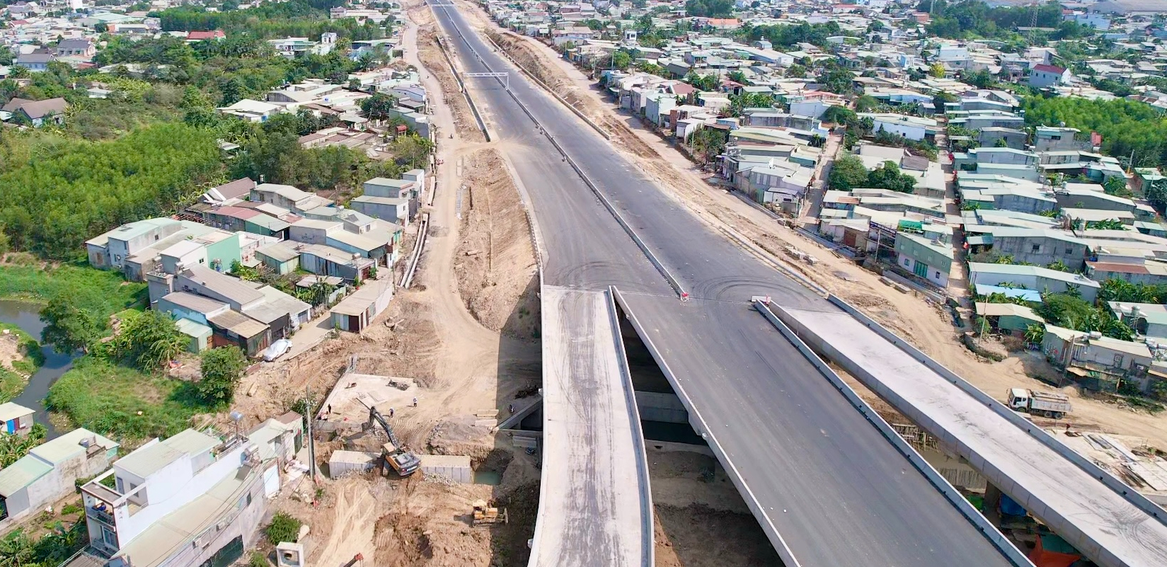Theo ghi nhận thực tế, công nhân, kỹ sư được huy động dàn trải trên toàn tuyến chia việc theo từng mũi thi công. Đoạn đầu tuyến gần nút giao Võ Nguyên Giáp kéo dài đến hết phường Phước Tân đường đã hoàn thành thảm nhựa đang lắp dải phân cách cứng, lan can… Những đoạn còn lại có một số vị trí đường đã lên đá, trải vải địa kỹ thuật, tưới bám dính, sẵn sàng chờ triển khai thảm nhựa.