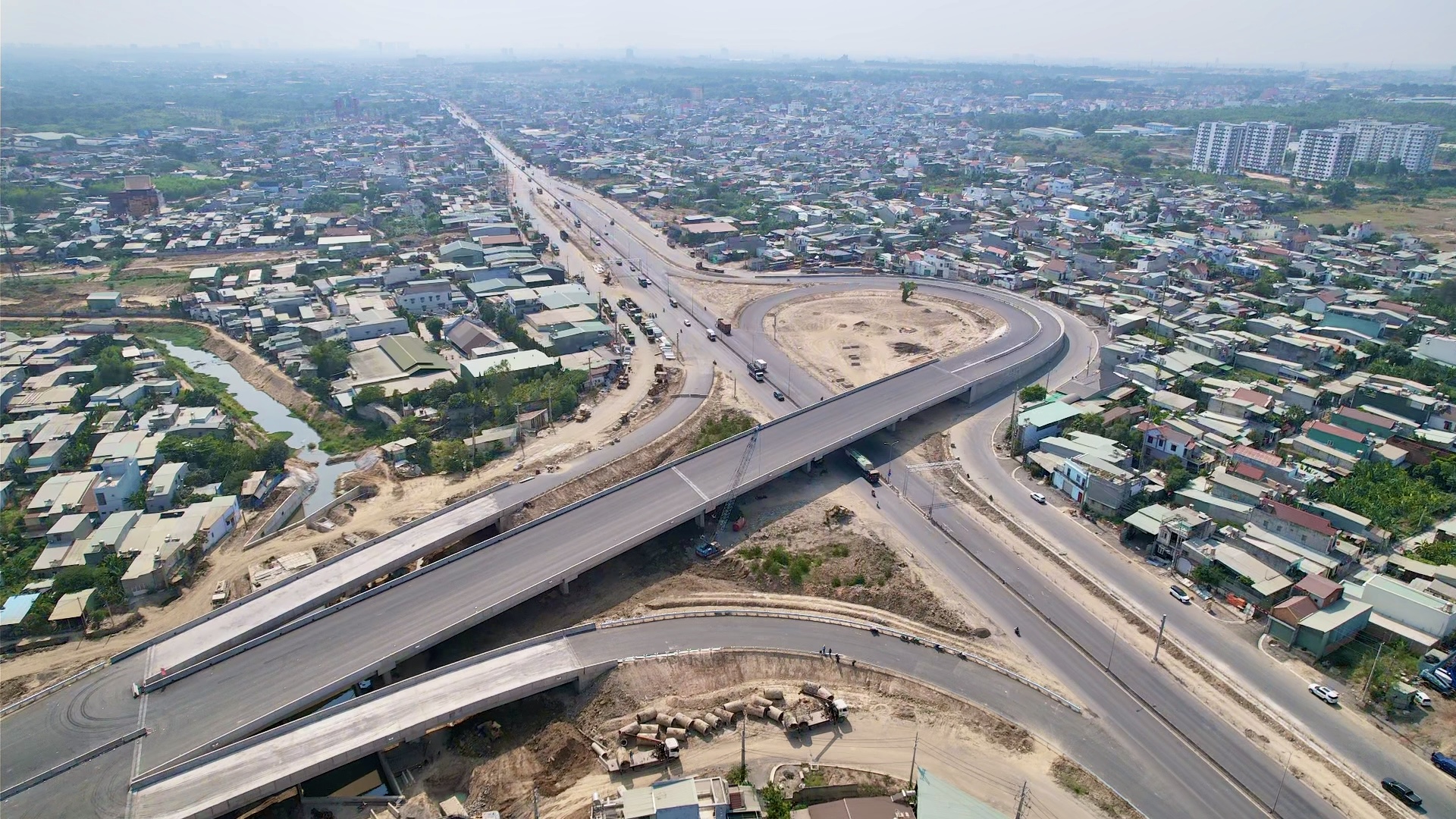 Nhìn từ trên cao, tuyến cao tốc hiện lên như một dải lụa thẳng tắp, vươn dài từ Đồng Nai hướng về TP.HCM, từng đoạn tuyến nối tiếp nhau liền mạch, rõ hình hài của một trục giao thông hiện đại. Dưới mặt đất, những kỹ sư, công nhân cùng máy móc thoạt nhìn chỉ như những chấm nhỏ nhưng nhờ những chấm nhỏ ấy từng mét đường đang được kiến tạo, góp phần hoàn thiện tuyến cao tốc liên vùng.