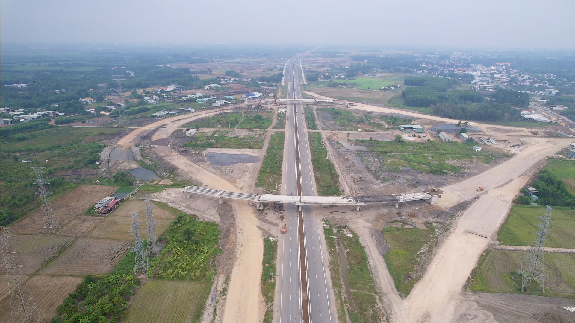 “Chúng tôi thông xe kỹ thuật nhưng việc lưu thông vẫn phải chia thành hai giai đoạn, do còn chờ hoàn thiện cầu Phước Khánh và đường Vành đai 3 TP.HCM. Hiện tuyến đường cơ bản đã hoàn thành, chỉ còn một số hạng mục cuối, anh em đang làm ngày đêm để tăng sản lượng,” ông Vị cho biết. (Trong ảnh, nút giao cao tốc và đường Vành đai 3 TP.HCM).